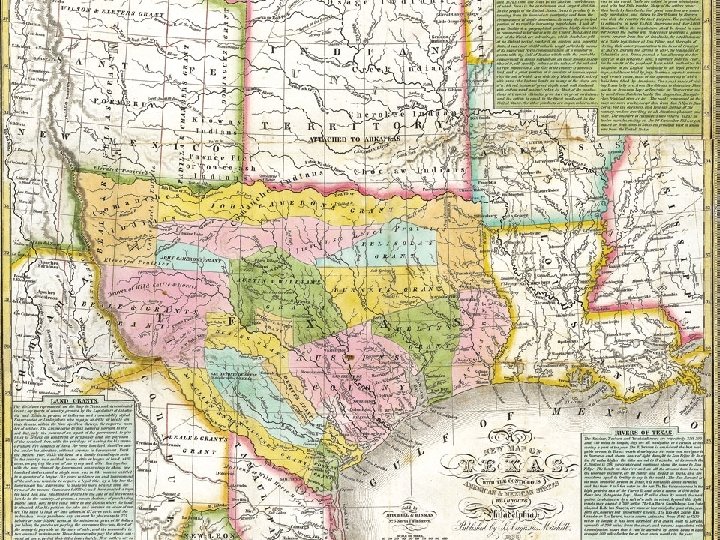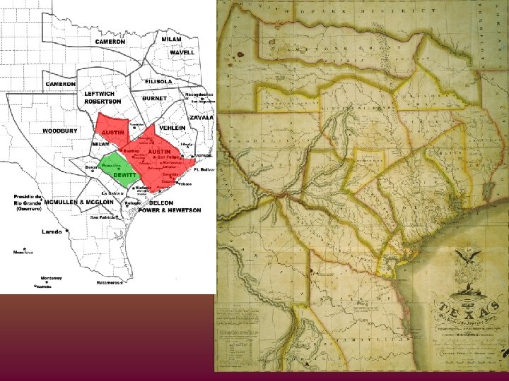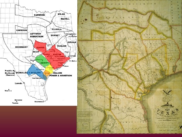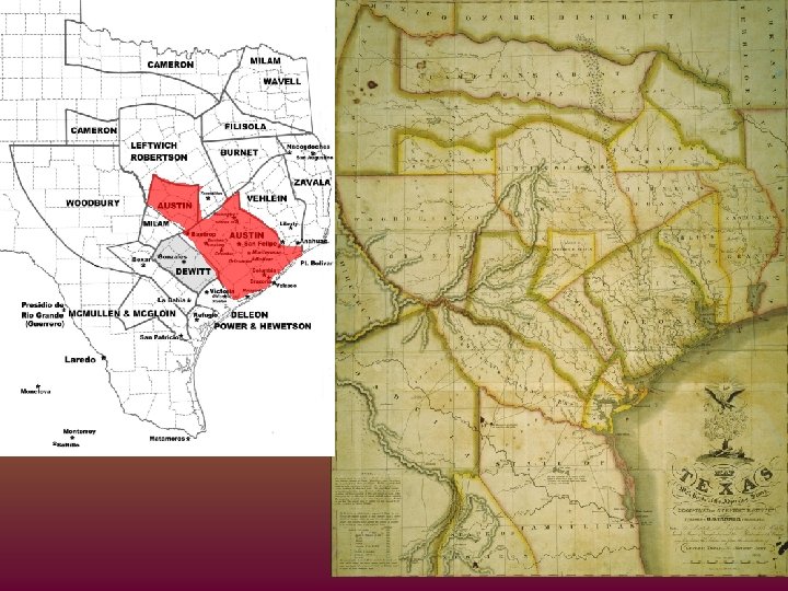 Major Empresario Grants Empresario Location Capital Problems Successes Stephen F. Austin (Father of Texas) Between the Colorado and Brazos Rivers San Felipe (de Austin) Drought Tonkawa & Karankawa Lively shipwrecked Disputes over boundaries Mexican gov’t revoked right to settle Convinced Mexican gov’t to let him settle Father of TX – 1 st colonize Americans in Texas Settled nearly 300 families Green De. Witt West of Austin’s 1 st Colony Gonzales Native American Raids Settled 166 families 2 nd in number to Austin Martin De Leon South of De Witt along the Guadalupe. Near the coast Victoria Native American Raids Forced to leave TX because of anti. Mexican sentiments Did a lot to promote the cattle industry in Texas Victoria important center for trade between Mexico and Texas