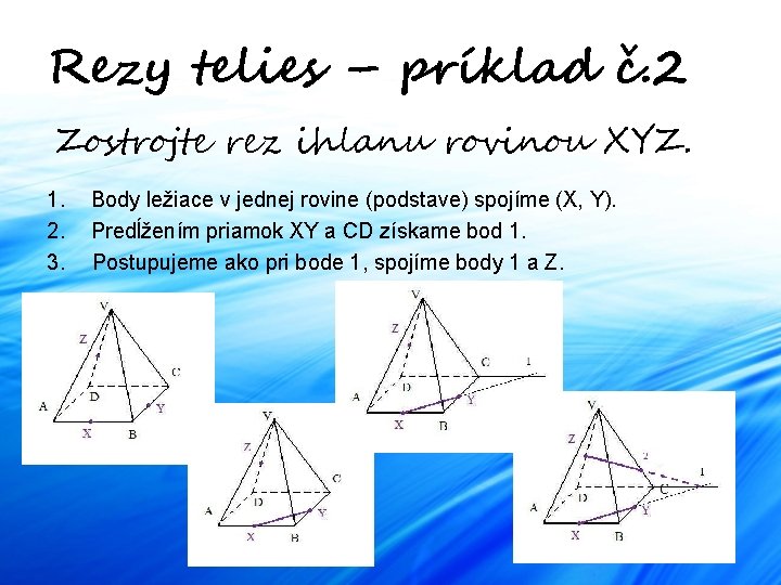 Rezy telies – príklad č. 2 Zostrojte rez ihlanu rovinou XYZ. 1. 2. 3. Body ležiace v jednej rovine (podstave) spojíme (X, Y). Predĺžením priamok XY a CD získame bod 1. Postupujeme ako pri bode 1, spojíme body 1 a Z.