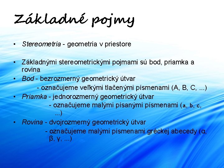 Základné pojmy • Stereometria - geometria v priestore • Základnými stereometrickými pojmami sú bod, priamka a rovina • Bod - bezrozmerný geometrický útvar - označujeme veľkými tlačenými písmenami (A, B, C, . . . ) • Priamka - jednorozmerný geometrický útvar - označujeme malými písanými písmenami (a, b, c, . . . ) • Rovina - dvojrozmerný geometrický útvar - označujeme malými písmenami gréckej abecedy (α, β, γ, . . . )