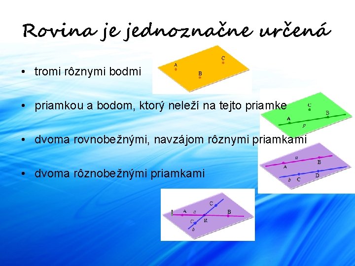 Rovina je jednoznačne určená • tromi rôznymi bodmi • priamkou a bodom, ktorý neleží na tejto priamke • dvoma rovnobežnými, navzájom rôznymi priamkami • dvoma rôznobežnými priamkami