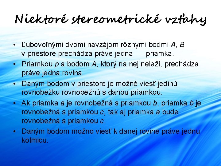 Niektoré stereometrické vzťahy • Ľubovoľnými dvomi navzájom rôznymi bodmi A, B v priestore prechádza práve jedna priamka. • Priamkou p a bodom A, ktorý na nej neleží, prechádza práve jedna rovina. • Daným bodom v priestore je možné viesť jedinú rovnobežku rovnobežnú s danou priamkou. • Ak priamka a je rovnobežná s priamkou b, priamka b je rovnobežná s priamkou c, tak aj priamka a bude rovnobežná s priamkou c. • Daným bodom možno viesť k danej rovine práve jednu kolmicu.