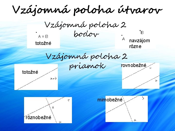 Vzájomná poloha útvarov Vzájomná poloha 2 bodov totožné navzájom rôzne Vzájomná poloha 2 rovnobežné priamok mimobežné rôznobežné