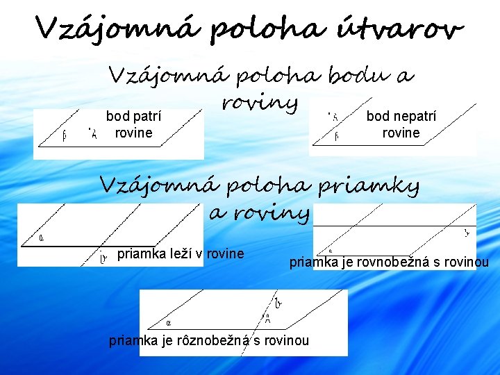 Vzájomná poloha útvarov Vzájomná poloha bodu a roviny bod patrí rovine bod nepatrí rovine Vzájomná poloha priamky a roviny priamka leží v rovine priamka je rovnobežná s rovinou priamka je rôznobežná s rovinou