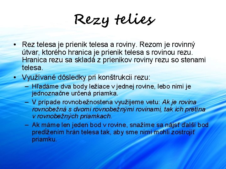 Rezy telies • Rez telesa je prienik telesa a roviny. Rezom je rovinný útvar, ktorého hranica je prienik telesa s rovinou rezu. Hranica rezu sa skladá z prienikov roviny rezu so stenami telesa. • Využívané dôsledky pri konštrukcii rezu: – Hľadáme dva body ležiace v jednej rovine, lebo nimi je jednoznačne určená priamka. – V prípade rovnobežnostena využijeme vetu: Ak je rovina rovnobežná s dvomi rovnobežnými rovinami, tak ich pretína v rovnobežných priamkach. – Ak máme len jeden bod v rovine, snažíme sa nájsť ďalší bod predĺžením hrán telesa tak, aby sme nimi mohli zostrojiť priamku.