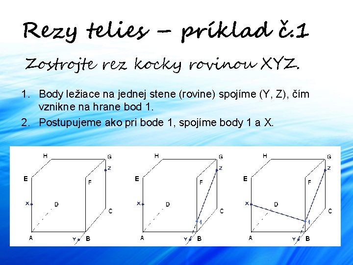 Rezy telies – príklad č. 1 Zostrojte rez kocky rovinou XYZ. 1. Body ležiace na jednej stene (rovine) spojíme (Y, Z), čím vznikne na hrane bod 1. 2. Postupujeme ako pri bode 1, spojíme body 1 a X.