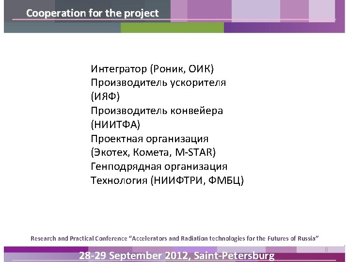 Step to future: Sterilization plant based 2 accelerators ILU-10 RF-accelerator ULR-10 -12 Linac accelerator Energy/penetration 5 Me. V/ 4 g/cm 2 10 Me. V/ 8 g/cm 2 Up to 8 g/cm 2 Power/Productivity 50 k. W/ 4500 kg/h 12 k. W/ 1100 kg/h 62 k. W/ 5600 kg/h Production Surgical sets and clothes cotton wool, bandages All Cost 1 000 k. E 1 500 k. E 2 500 k. E • Reliable • Efficiency of beam using • X-ray mode Σ • Wide range of packs 28 -29 September 2012, Saint-Petersburg
