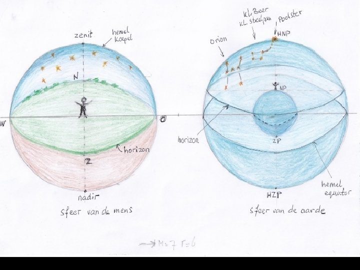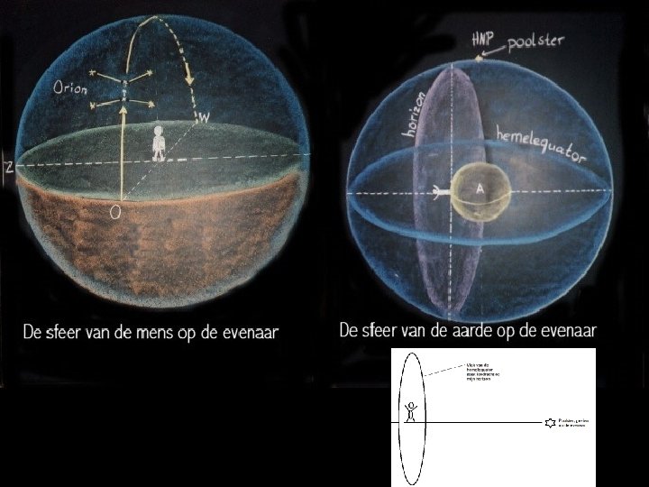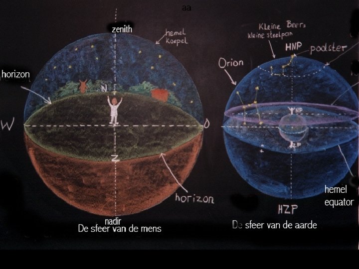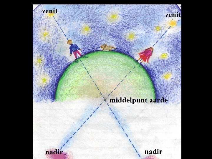 Zenit en nadir ► Onder het zenit verstaat men een punt dat zich loodrecht boven ons bevindt, maar oneindig ver weg ◄ ► Onder het nadir verstaat men een punt dat zich loodrecht onder ons bevindt, maar oneindig ver weg ◄ Eigenschappen: • zenit en nadir liggen dus precies tegenover elkaar • een dier leeft niet rechtop en kan dus geen zenit en nadir hebben. Het zijn specifiek menselijke kwaliteiten! • stel je de lichaams-assen van alle mensen op aarde voor. Die kruisen elkaar precies……. in het middelpunt van de aarde! Zo kunnen wij ons via onze nadirs verbonden voelen met elk ander mens op aarde. • er zijn geen twee mensen op aarde die het zelfde zenit hebben (of de ene mens zou op de schouders van de ander moeten gaan staan – zoals we in de klas deden!)