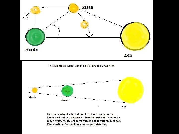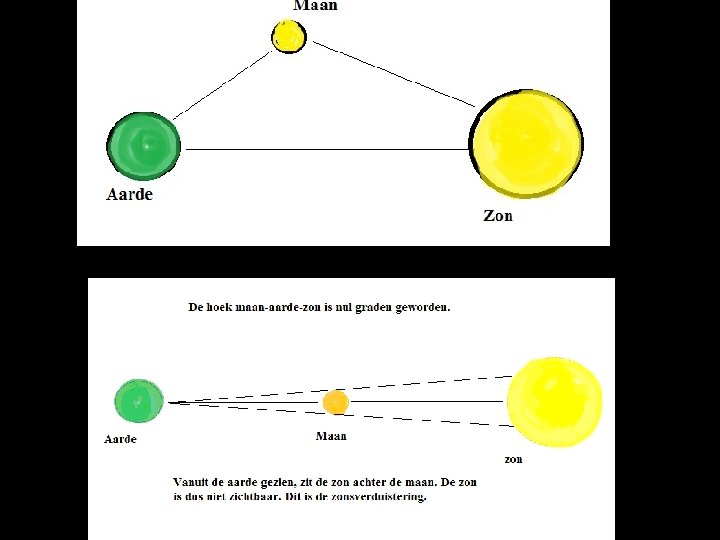 Normale situatie Er is altijd sprake van een driehoek tussen zon, aarde en maan De zonsverduistering: Hoek maan-aarde-zon = 0° De maansverduistering: Hoek maan-aarde-zon = 180°