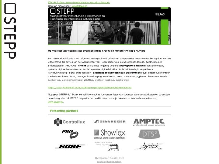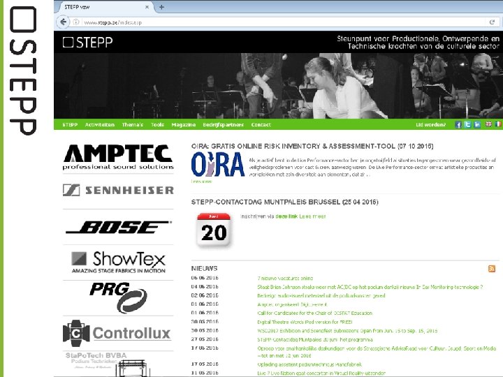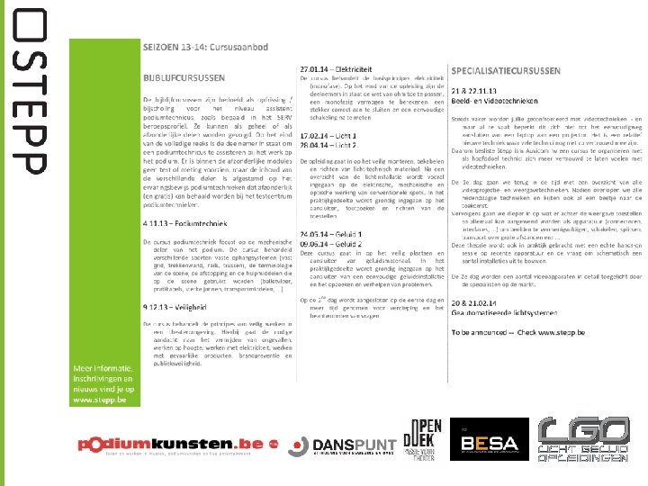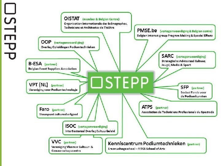 WHAT’S IN A NAME ? Steunpunt voor Productionele, Ontwerpende & Technische krachten van de Brede Culturele sector “STEPP is een acroniem en vertaalbaar als 'Steunpunt voor Technici, Event & Productionele Professionals‘ 'Support for Technicians & Event Production Professionals' en 'Soutien pour Techniciens & Professionels de Production', wat wijst op het internationaal karakter van onze branche en onze werking. ”