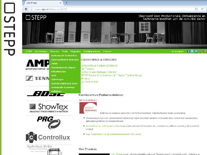 PARTNERSHIPS & PROJECTS Internationale projecten: Digital Theatre Words CEN/TC 433 hijsinstallaties Databases: Theatre Architecture, Theatre School, … Production tools (Theatre Atlas, rider templates, …) Technical Invention Prize Theatre Architecture Competition PQ / World Stage Design …