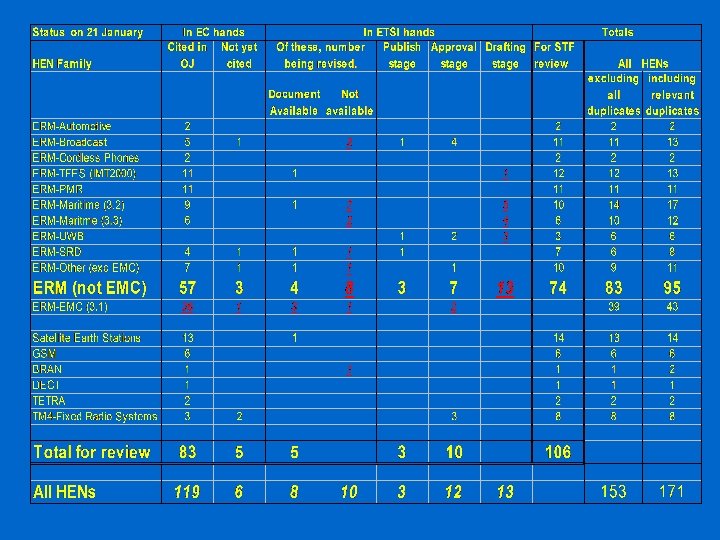Minor discrepancies • In ETSI WP but not on • On New. Approach web but not in ETSI WP – EN 300 830 v 1. 1. 1 – EN 301 011 v 1. 1. 1 – EN 301 427 v 1. 2. 1 – EN 300 385 : 1999 – EN 301 419 -3 v 5. 0. 2 – We did not check superseded ENs – We ignored the ETSs though some are still current