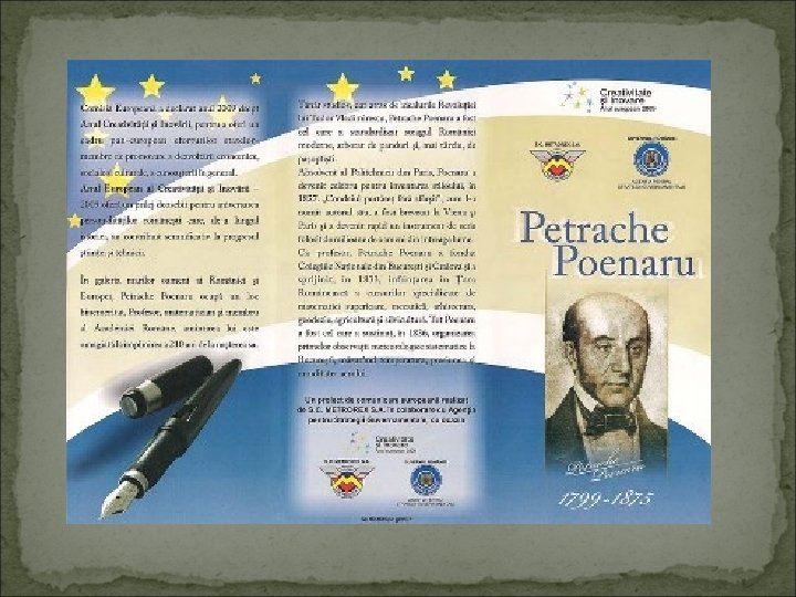 „Inventatorii români au dat omenirii invenţii care sunt folosite în toate ţările lumii, de nenumăraţi oameni Condeiul portăreţ (tocul rezervor/stiloul) - Petrache Poenaru
