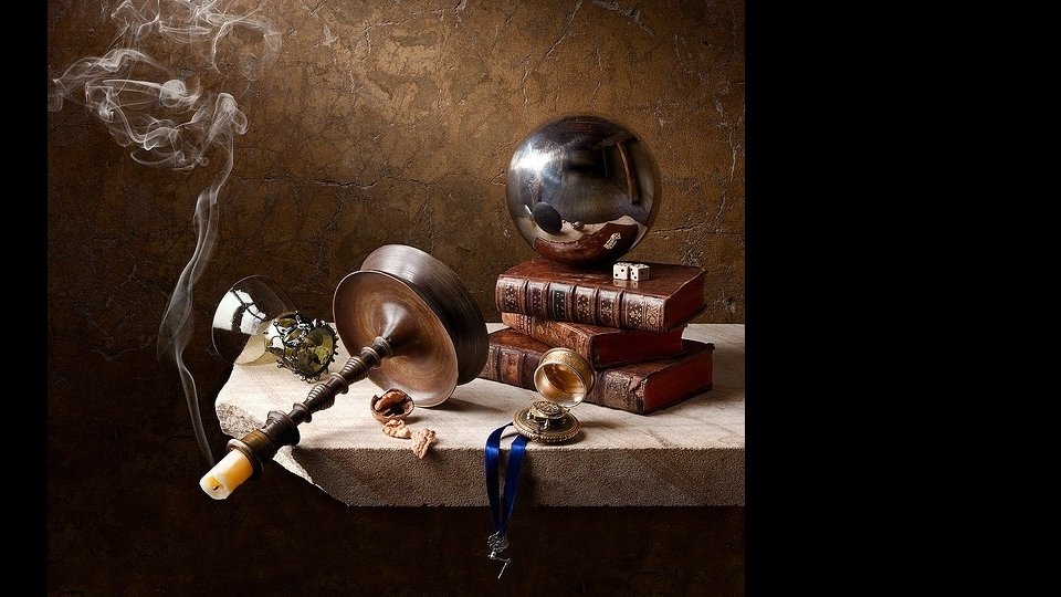 • Sea shells, sometimes living snail, a mollusc shell is the remains of once-living animal, it means death and frailty. Creeping is the personification of death Sin snail laziness. Large shellfish represent the duality of nature, symbol of lust, even one of the deadly sins. • Fuming candle or oil lamp is a symbol of the human soul, its loss symbolizes the care. • Cups, playing cards or dice, chess (rarely) is a sign of faulty life goal, finding pleasures and sinful life. Equality of opportunity in gambling meant also the reprehensible anonymity. Cigar tube — a symbol of transient and elusive of earthly delights. • Mirrors, glass balls — a symbol of vanity, mirror, reflection, shadow sign too.
