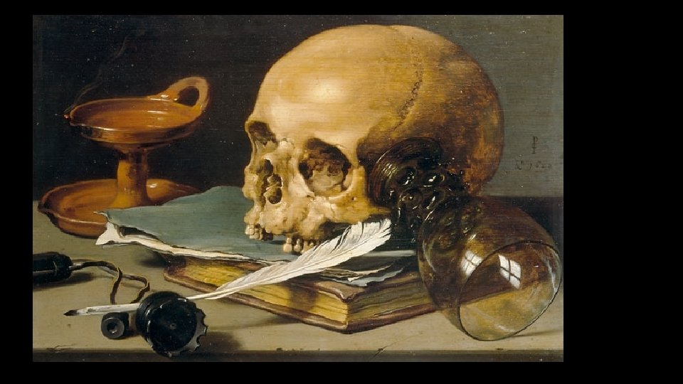 Vanitas Still life • Vanitas is a type of symbolic work of art especially associated with still life painting in Flanders and the Netherlands in the 16 th and 17 th centuries. • The Latin word means "vanity" and loosely translated corresponds to the meaninglessness of earthly life and the transient nature of all earthly goods and pursuits.