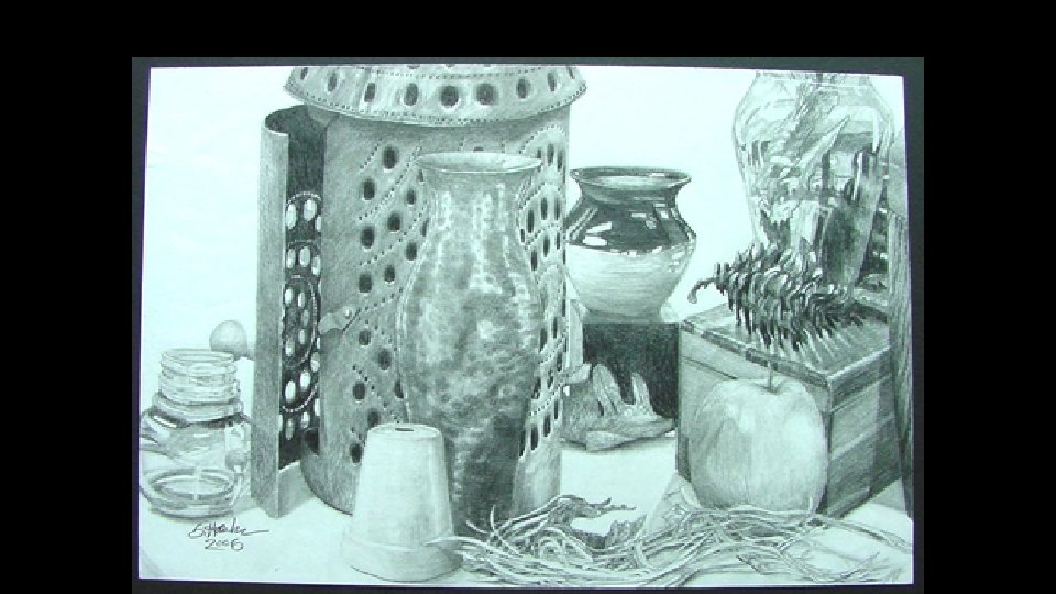 What makes a good/ bad still life? • Bad- evenly spaced, symmetrical, not touching, plain, boring, same size, stacked object sculpture, everything face the same way. • Good- Overlapping, in groups, touching, asymmetrical, off the paper, different heights, variety of objects, a theme, natural looking, opposite diagonals.