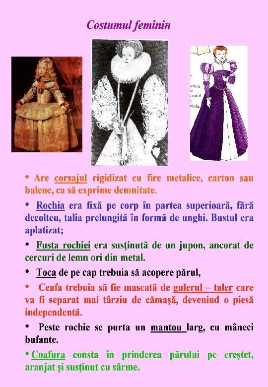 Costumul francez in epoca Renasterii (secolul al XVI lea) Costumul feminin -este strâns pe bust şi fixat mai sus de talie cu o centură, ornată cu pietre scumpe; - Materialele folosite erau de obicei matasuri si catifele italiene. - Faţa a femeilor avea forma de inimǎ, conturata de rulourile pǎrului îmbinate in unghi pe frunte sau de scufia mulata in acelasi fel. Gulerul era inalt, apretat, ridicat la spate în jurul decolteului. Fusta era susţinuta pe solduri de un cerc de sarma in forma de roatǎ. Sculptural, trupul era modelat ca si in Italia, in volume largi, regulate, cu contur rotunjit, gratios, dar si cu suprafete rigide sustinute ca in Spania de corset si sarme.