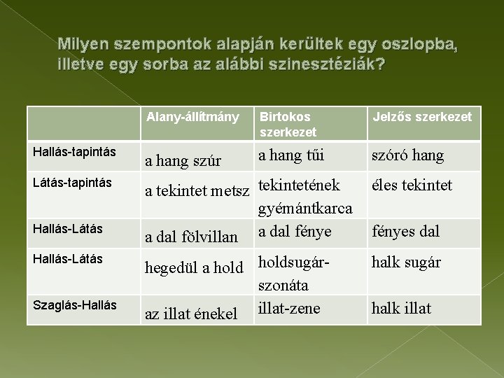 Milyen szempontok alapján kerültek egy oszlopba, illetve egy sorba az alábbi szinesztéziák? Alany-állítmány Birtokos szerkezet Jelzős szerkezet Hallás-tapintás a hang szúr a hang tűi szóró hang Látás-tapintás a tekintet metsz tekintetének gyémántkarca a dal fölvillan a dal fénye éles tekintet hegedül a holdsugárszonáta az illat énekel illat-zene halk sugár Hallás-Látás Szaglás-Hallás fényes dal halk illat