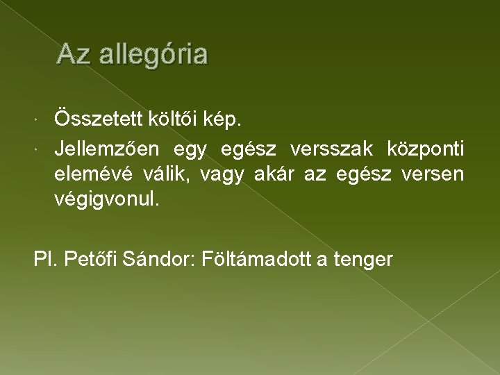 Az allegória Összetett költői kép. Jellemzően egy egész versszak központi elemévé válik, vagy akár az egész versen végigvonul. Petőfi Sándor: Föltámadott a tenger