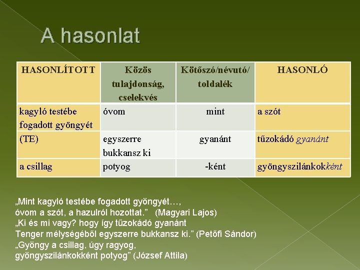 A hasonlat HASONLÍTOTT kagyló testébe fogadott gyöngyét (TE) a csillag Közös tulajdonság, cselekvés óvom egyszerre bukkansz ki potyog Kötőszó/névutó/ toldalék mint gyanánt -ként „Mint kagyló testébe fogadott gyöngyét…, óvom a szót, a hazulról hozottat. ” (Magyari Lajos) „Ki és mi vagy? hogy így tűzokádó gyanánt Tenger mélységéből egyszerre bukkansz ki. ” (Petőfi Sándor) „Gyöngy a csillag, úgy ragyog, gyöngyszilánkokként potyog” (József Attila) HASONLÓ a szót tűzokádó gyanánt gyöngyszilánkokként