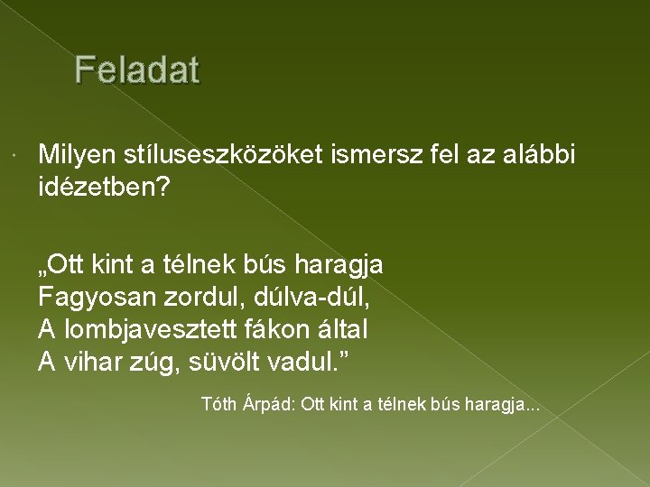Feladat Milyen stíluseszközöket ismersz fel az alábbi idézetben? „Ott kint a télnek bús haragja Fagyosan zordul, dúlva-dúl, A lombjavesztett fákon által A vihar zúg, süvölt vadul. ” Tóth Árpád: Ott kint a télnek bús haragja. . .