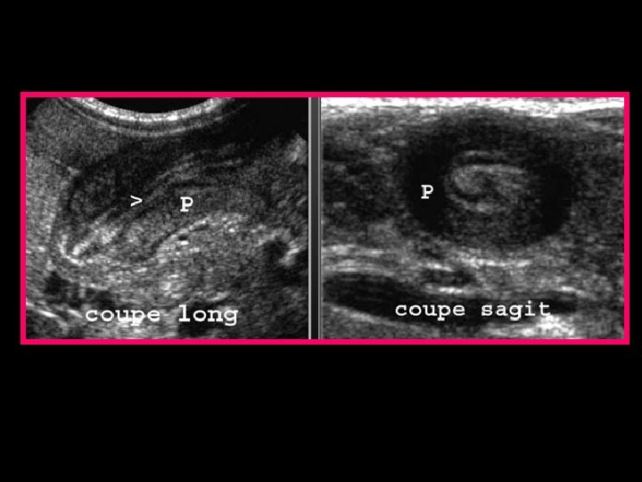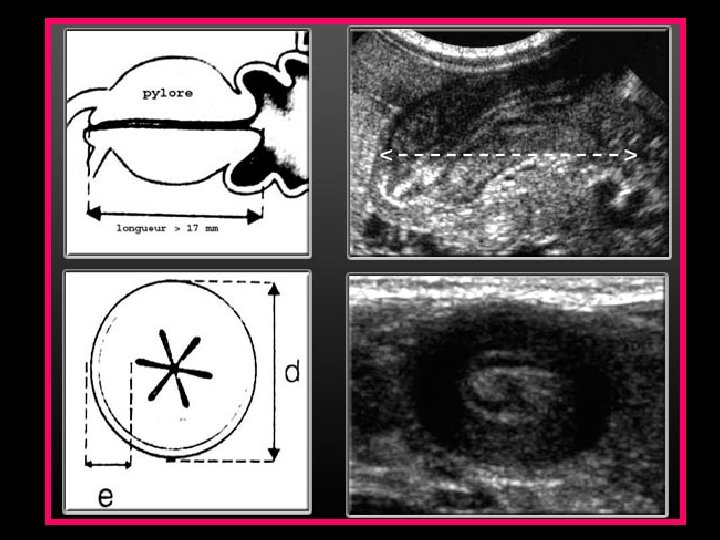 ECHOGRAPHIE ABDOMINALE • Maître examen +++ • Diagnostic précoce • Confirme le diagnostic : - longueur du pylore > 19 mm - largeur > 13 mm - épaisseur de la paroi musculaire > 4 mm • Image en cocarde en coupe transversale et en sandwich en longitudinale