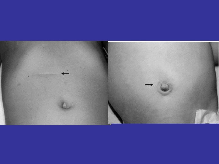 V- CLINIQUE 1) Vomissements : +++ - Après un intervalle libre - Blanc, facile, en jet , jamais bilieux - Post-prandiaux précoce - Rebelle au Tt - Post-prandiaux tardifs dans les formes anciennes - Affamé après les vomissements