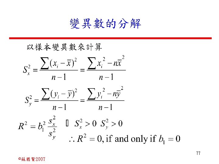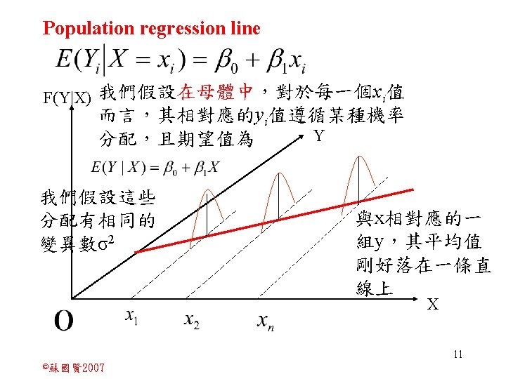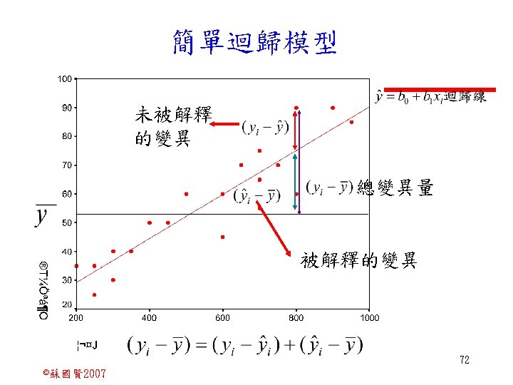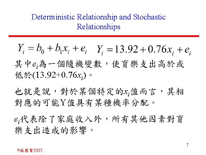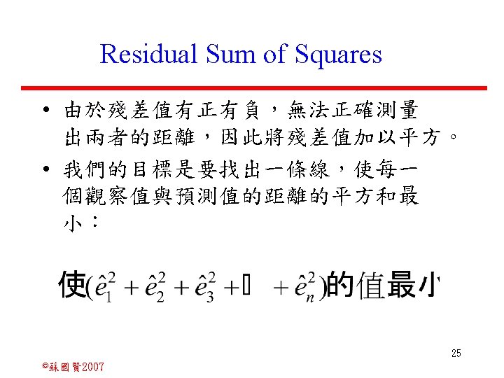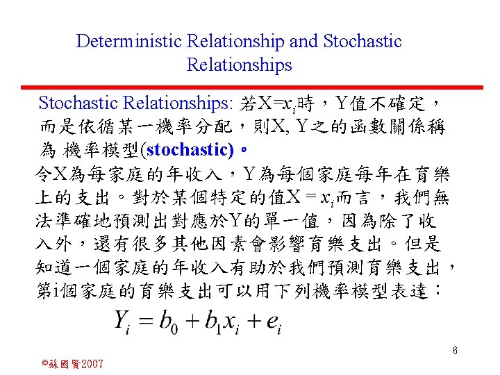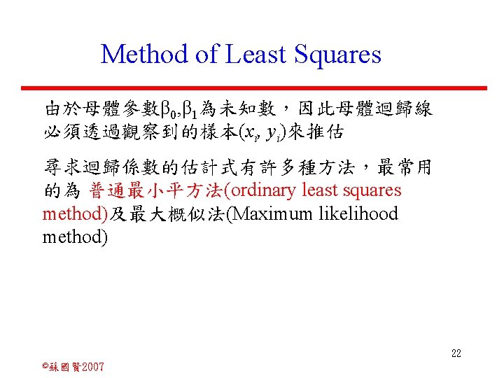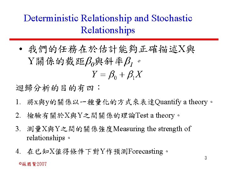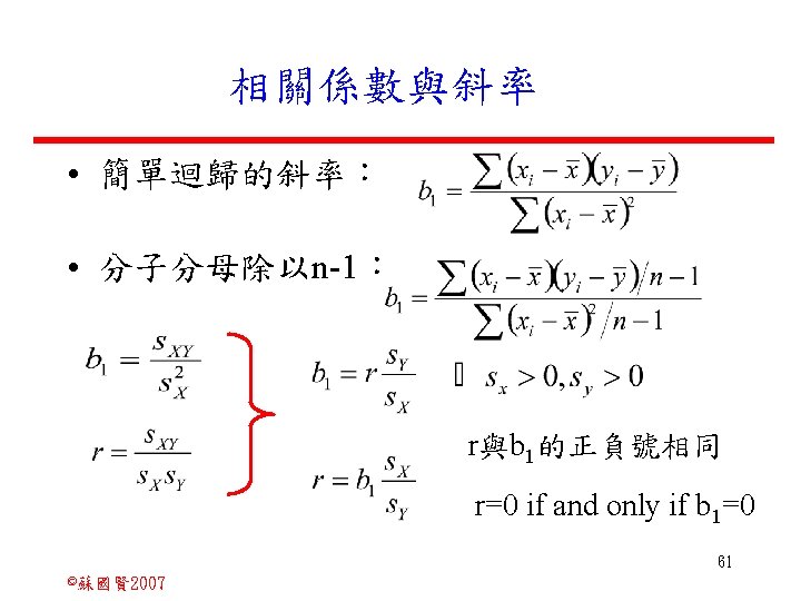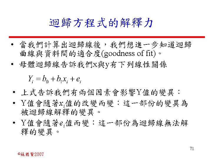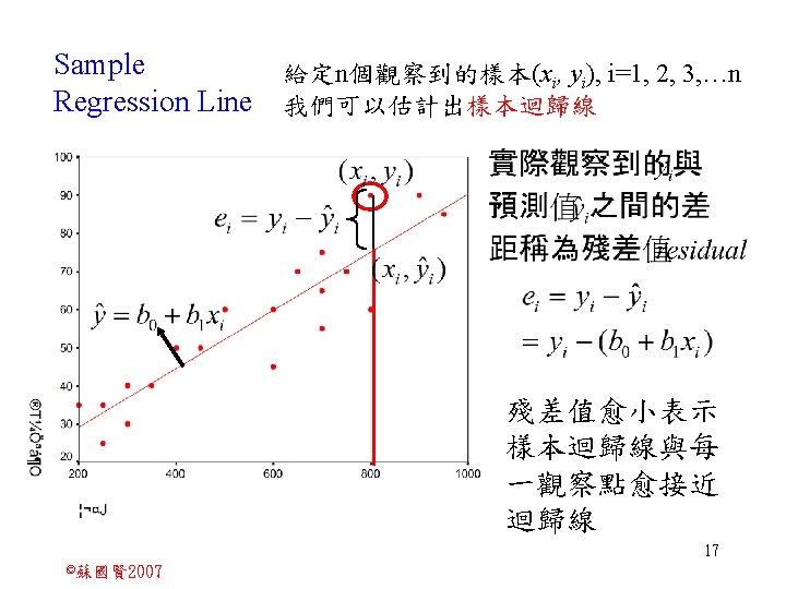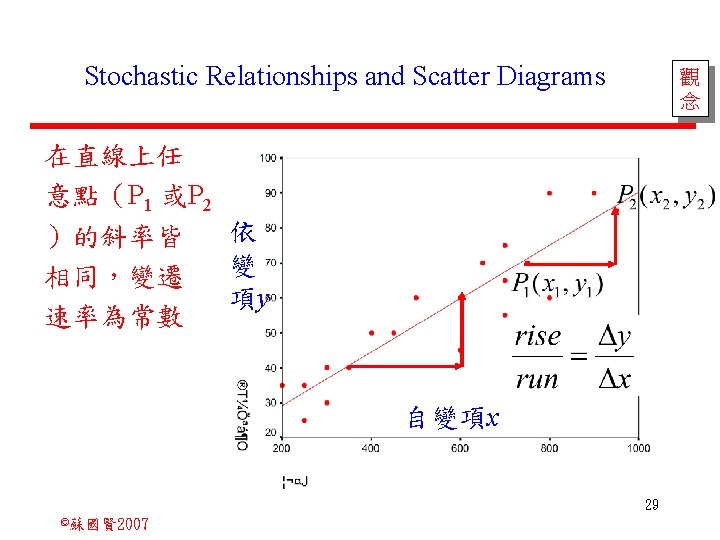 Stochastic Relationships and Scatter Diagrams 0 2 2007 Slides: 87 Download presentation Stochastic Relationships and Scatter Diagrams 截距 0 2 ©蘇國賢 2007 Deterministic Relationship and Stochastic Relationships 在Y=f(X)的函數關係中,若每一個x值僅對應於單 一的y值,則X, Y之間的關係為完全決定的函數關 係,稱為確定模型(deterministic) Deterministic Relationships 電腦每台$960元,X為電腦台數,Y為總收益 4 ©蘇國賢 2007 Deterministic Relationship and Stochastic Relationships 華氏與攝氏的關係為確定模型(deterministic) 所有的資料點都 剛好落在線上 5 ©蘇國賢 2007 Deterministic Relationship and Stochastic Relationships ei的來源: (1)行為的隨機性(human indeterminacy) (2)測量的誤差(measurement error) (3)其他無法觀察到影響Y的因素(omission of the influence of innumerable chance events) 8 ©蘇國賢 2007 F(Y|X) Y E(y 1) E(y 2) x 1 E(y 3) x 2 x 3 12 ©蘇國賢 2007 Method of Least Squares 尋求迴歸係數的估計式有許多種方法,最常用 的為 普通最小平方法(ordinary least squares method)及最大概似法(Maximum likelihood method) 21 ©蘇國賢 2007 Method of Least Squares 24 ©蘇國賢 2007 Residual Sum of Squares 當b 0=? b 1 =? 時SSE會是最小值? 26 ©蘇國賢 2007 Stochastic Relationships and Scatter Diagrams 直線上任兩 點P 1 P 2,從P 1 移至P 2,x軸 座標移動 △x = x 2 - x 1 觀 念 依 變 項y y軸座標移動 △y = y 2 - y 1 自變項x 27 ©蘇國賢 2007 Stochastic Relationships and Scatter Diagrams 直線上任兩 點P 1 P 2,此線 的斜率定義 為: 觀 念 依 變 項y 自變項x 28 ©蘇國賢 2007 微分(derivative)簡介 Secant line 割線 34 ©蘇國賢 2007 微分(derivative)簡介 Secant line 割線 35 ©蘇國賢 2007 微分(derivative)簡介 Secant line 割線 36 ©蘇國賢 2007 微分(derivative)簡介 Tangent line 切線 37 ©蘇國賢 2007 Slope of the Tangent Line Tangent lin 切線 38 ©蘇國賢 2007 Slope of the Tangent Line Tangent lin 切線 39 ©蘇國賢 2007 Slope of the Tangent Line 40 ©蘇國賢 2007 Slope of the Tangent Line Tangent lin 切線 41 ©蘇國賢 2007 Slope of the Tangent Line Tangent lin 切線 m = -4 m=2 42 ©蘇國賢 2007 Derivative • The derivative of function f with respect to x is the function f ' defined by 43 ©蘇國賢 2007 Notation for the derivative • f ' (x) 讀做�"f prime of x" • y ' 讀做 "y prime" • "the derivative of y with respect to x" "dee y dee x" • "the derivative of f(x) with respect to x" "dee f(x) dee x" 44 ©蘇國賢 2007 Let f(x) = x 3, Find the derivative 45 ©蘇國賢 2007 Let f(x) = x 2 -5 x+1, Find the derivative 46 ©蘇國賢 2007 Basic Rules for Differentiation • Rule 1: the derivative of a constant is zero 47 ©蘇國賢 2007 Basic Rules for Differentiation • Rule 2: the derivative of a linear function 48 ©蘇國賢 2007 Basic Rules for Differentiation • Rule 3: the derivative of a power function 49 ©蘇國賢 2007 Residual Sum of Squares 當b 0=? b 1 =? 時SSE會是最小值? 51 ©蘇國賢 2007 Residual Sum of Squares SSE會有最小值 52 ©蘇國賢 2007 Residual Sum of Squares 53 ©蘇國賢 2007 Residual Sum of Squares Normal Equation 將(1)式兩邊除以n 54 ©蘇國賢 2007 Residual Sum of Squares 將(1)式乘以Σxi 將(2)式乘以n 55 ©蘇國賢 2007 Residual Sum of Squares 將(5)-(4) 56 ©蘇國賢 2007 Residual Sum of Squares 上下同除n 57 ©蘇國賢 2007 Residual Sum of Squares 58 ©蘇國賢 2007 Residual Sum of Squares 59 ©蘇國賢 2007 Sample Correlation Coefficient, r 樣本相關係數 • 樣本相關係數: 60 ©蘇國賢 2007 STATA 64 ©蘇國賢 2007 例題 求x與y的correlation? 65 ©蘇國賢 2007 變異數的分解 總變異量 Sum of Square Total 解釋變異量 Regression Sum of Square 未解釋變異量 Sum of Square Error 75 ©蘇國賢 2007 r=0. 994 r 2=0. 989 83 ©蘇國賢 2007 r=0. 921 r 2=0. 849 84 ©蘇國賢 2007 Page 136 85 ©蘇國賢 2007 r 2 Variance of value y = 5. 30091 Variance of predicted y= 5. 24135 86 ©蘇國賢 2007