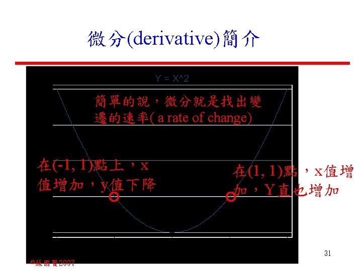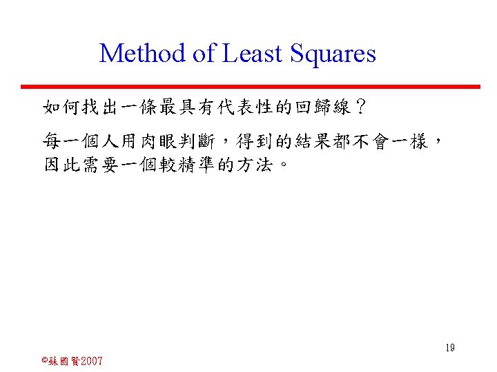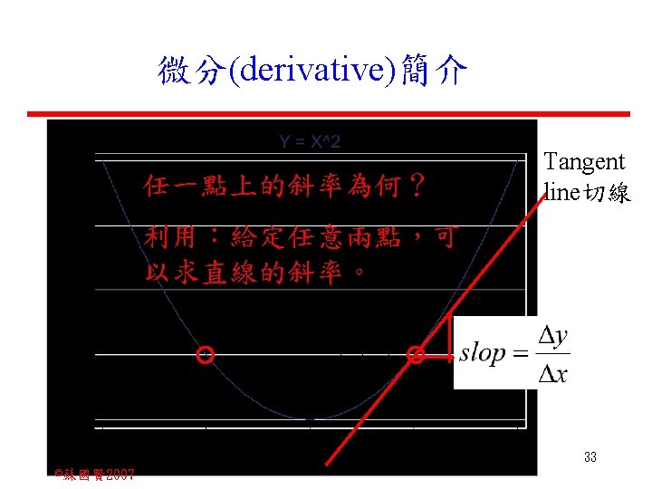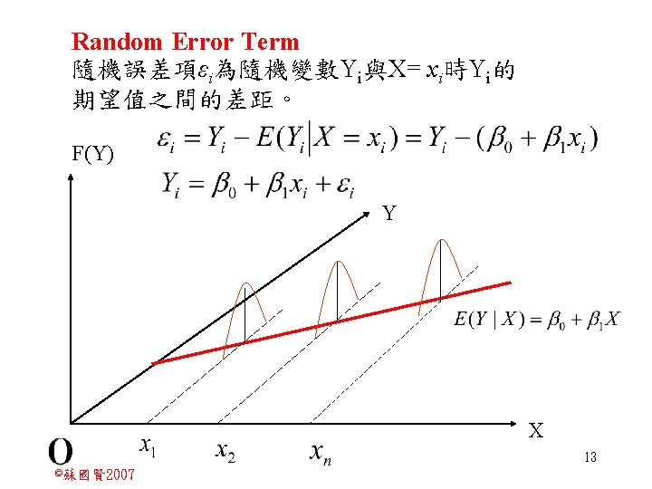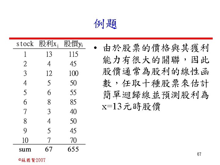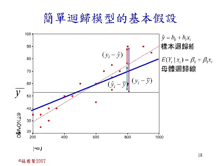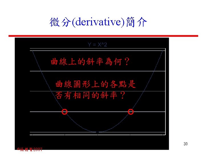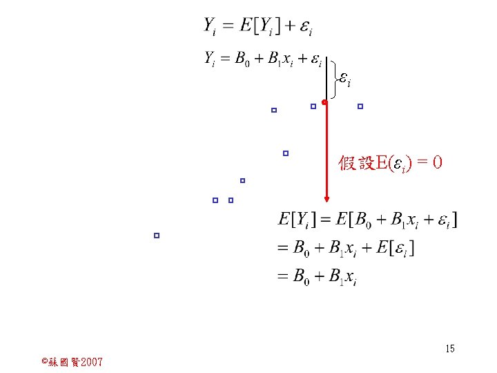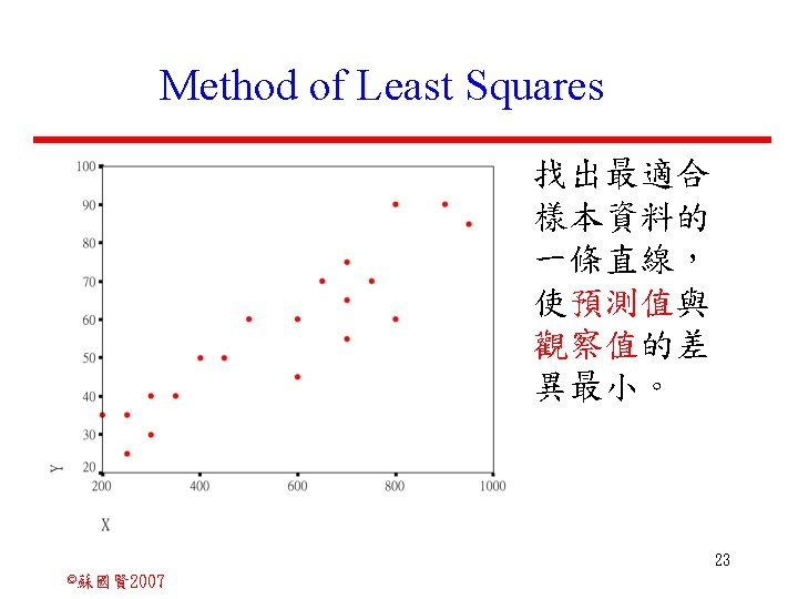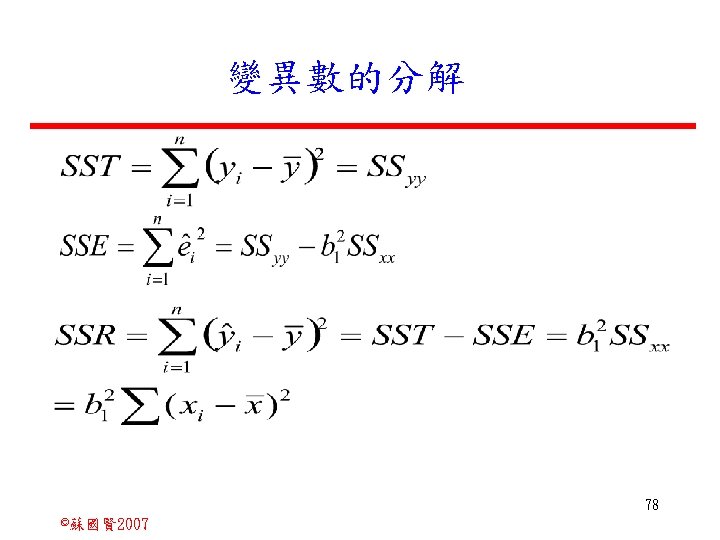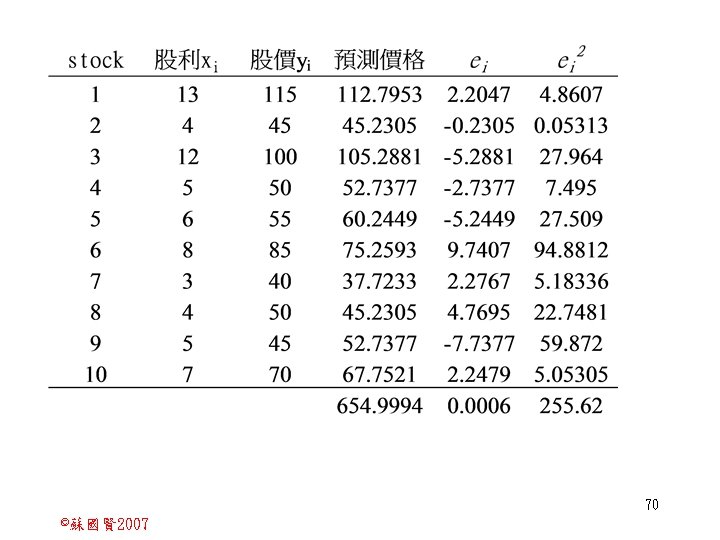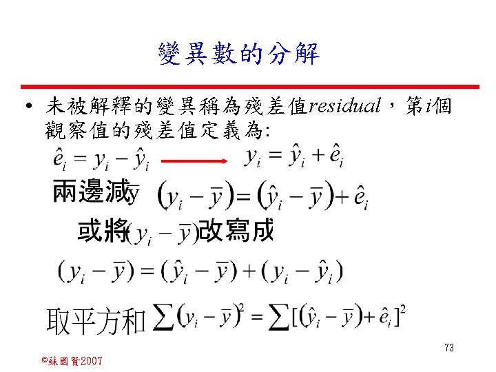 Stochastic Relationships and Scatter Diagrams 0 2 2007 Slides: 87 Download presentation Stochastic Relationships and Scatter Diagrams 截距 0 2 ©蘇國賢 2007 Deterministic Relationship and Stochastic Relationships 在Y=f(X)的函數關係中,若每一個x值僅對應於單 一的y值,則X, Y之間的關係為完全決定的函數關 係,稱為確定模型(deterministic) Deterministic Relationships 電腦每台$960元,X為電腦台數,Y為總收益 4 ©蘇國賢 2007 Deterministic Relationship and Stochastic Relationships 華氏與攝氏的關係為確定模型(deterministic) 所有的資料點都 剛好落在線上 5 ©蘇國賢 2007 Deterministic Relationship and Stochastic Relationships ei的來源: (1)行為的隨機性(human indeterminacy) (2)測量的誤差(measurement error) (3)其他無法觀察到影響Y的因素(omission of the influence of innumerable chance events) 8 ©蘇國賢 2007 F(Y|X) Y E(y 1) E(y 2) x 1 E(y 3) x 2 x 3 12 ©蘇國賢 2007 Method of Least Squares 尋求迴歸係數的估計式有許多種方法,最常用 的為 普通最小平方法(ordinary least squares method)及最大概似法(Maximum likelihood method) 21 ©蘇國賢 2007 Method of Least Squares 24 ©蘇國賢 2007 Residual Sum of Squares 當b 0=? b 1 =? 時SSE會是最小值? 26 ©蘇國賢 2007 Stochastic Relationships and Scatter Diagrams 直線上任兩 點P 1 P 2,從P 1 移至P 2,x軸 座標移動 △x = x 2 - x 1 觀 念 依 變 項y y軸座標移動 △y = y 2 - y 1 自變項x 27 ©蘇國賢 2007 Stochastic Relationships and Scatter Diagrams 直線上任兩 點P 1 P 2,此線 的斜率定義 為: 觀 念 依 變 項y 自變項x 28 ©蘇國賢 2007 微分(derivative)簡介 Secant line 割線 34 ©蘇國賢 2007 微分(derivative)簡介 Secant line 割線 35 ©蘇國賢 2007 微分(derivative)簡介 Secant line 割線 36 ©蘇國賢 2007 微分(derivative)簡介 Tangent line 切線 37 ©蘇國賢 2007 Slope of the Tangent Line Tangent lin 切線 38 ©蘇國賢 2007 Slope of the Tangent Line Tangent lin 切線 39 ©蘇國賢 2007 Slope of the Tangent Line 40 ©蘇國賢 2007 Slope of the Tangent Line Tangent lin 切線 41 ©蘇國賢 2007 Slope of the Tangent Line Tangent lin 切線 m = -4 m=2 42 ©蘇國賢 2007 Derivative • The derivative of function f with respect to x is the function f ' defined by 43 ©蘇國賢 2007 Notation for the derivative • f ' (x) 讀做�"f prime of x" • y ' 讀做 "y prime" • "the derivative of y with respect to x" "dee y dee x" • "the derivative of f(x) with respect to x" "dee f(x) dee x" 44 ©蘇國賢 2007 Let f(x) = x 3, Find the derivative 45 ©蘇國賢 2007 Let f(x) = x 2 -5 x+1, Find the derivative 46 ©蘇國賢 2007 Basic Rules for Differentiation • Rule 1: the derivative of a constant is zero 47 ©蘇國賢 2007 Basic Rules for Differentiation • Rule 2: the derivative of a linear function 48 ©蘇國賢 2007 Basic Rules for Differentiation • Rule 3: the derivative of a power function 49 ©蘇國賢 2007 Residual Sum of Squares 當b 0=? b 1 =? 時SSE會是最小值? 51 ©蘇國賢 2007 Residual Sum of Squares SSE會有最小值 52 ©蘇國賢 2007 Residual Sum of Squares 53 ©蘇國賢 2007 Residual Sum of Squares Normal Equation 將(1)式兩邊除以n 54 ©蘇國賢 2007 Residual Sum of Squares 將(1)式乘以Σxi 將(2)式乘以n 55 ©蘇國賢 2007 Residual Sum of Squares 將(5)-(4) 56 ©蘇國賢 2007 Residual Sum of Squares 上下同除n 57 ©蘇國賢 2007 Residual Sum of Squares 58 ©蘇國賢 2007 Residual Sum of Squares 59 ©蘇國賢 2007 Sample Correlation Coefficient, r 樣本相關係數 • 樣本相關係數: 60 ©蘇國賢 2007 STATA 64 ©蘇國賢 2007 例題 求x與y的correlation? 65 ©蘇國賢 2007 變異數的分解 總變異量 Sum of Square Total 解釋變異量 Regression Sum of Square 未解釋變異量 Sum of Square Error 75 ©蘇國賢 2007 r=0. 994 r 2=0. 989 83 ©蘇國賢 2007 r=0. 921 r 2=0. 849 84 ©蘇國賢 2007 Page 136 85 ©蘇國賢 2007 r 2 Variance of value y = 5. 30091 Variance of predicted y= 5. 24135 86 ©蘇國賢 2007