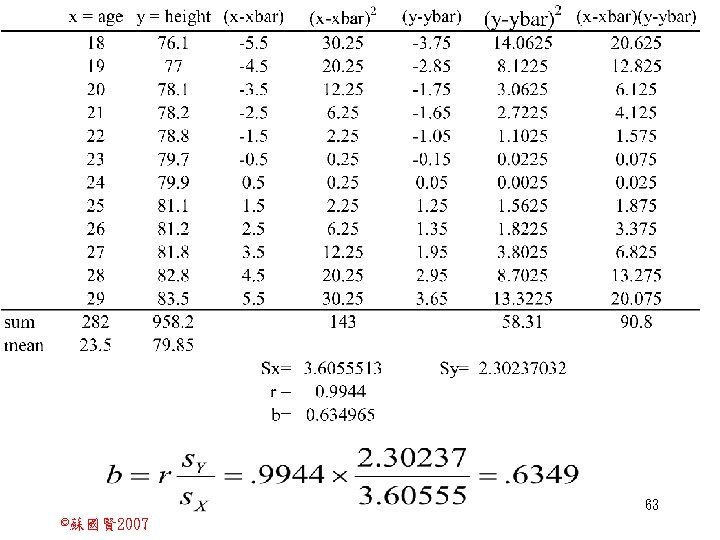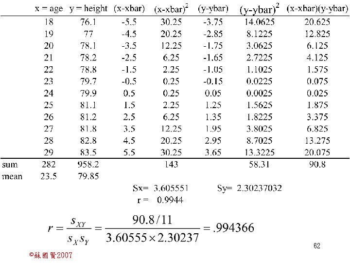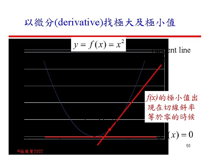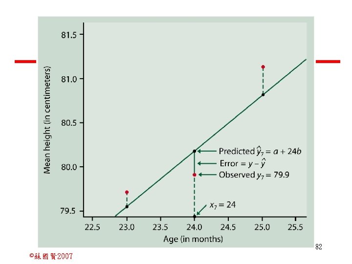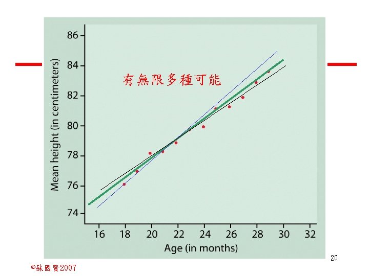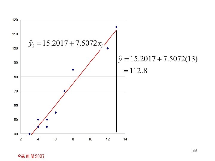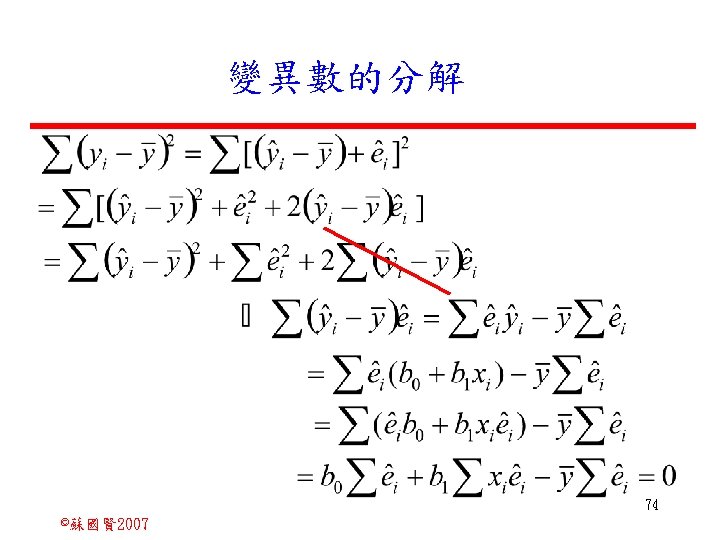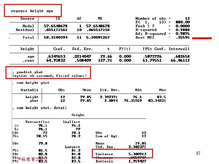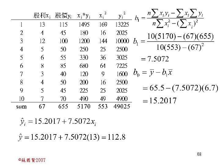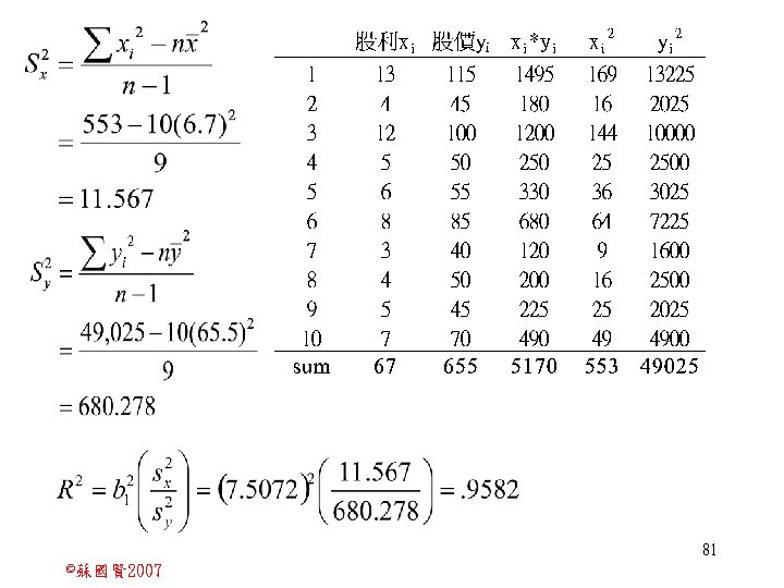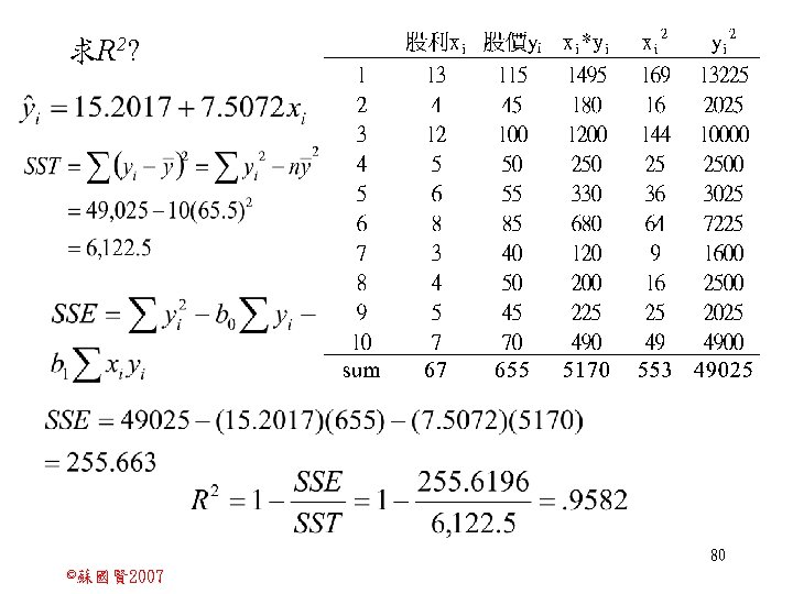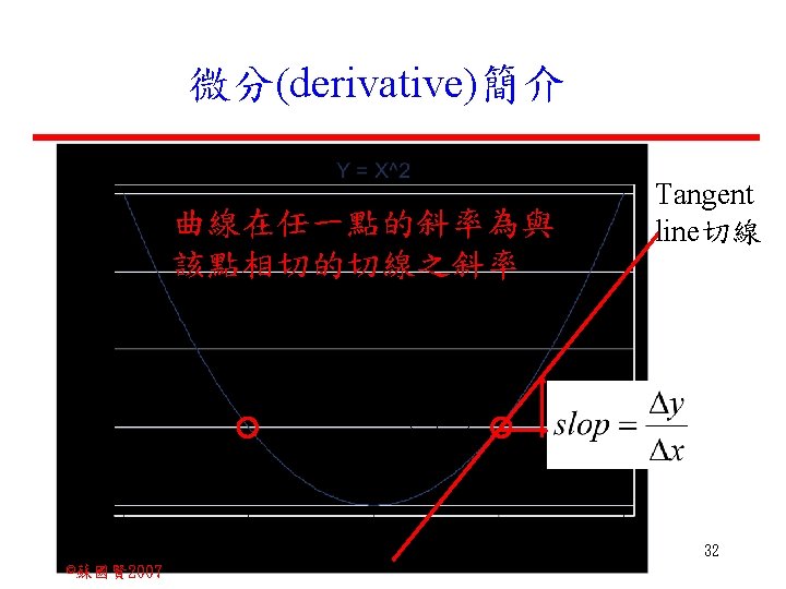Stochastic Relationships and Scatter Diagrams 0 2 2007 Slides: 87 Download presentation Stochastic Relationships and Scatter Diagrams 截距 0 2 ©蘇國賢 2007 Deterministic Relationship and Stochastic Relationships 在Y=f(X)的函數關係中,若每一個x值僅對應於單 一的y值,則X, Y之間的關係為完全決定的函數關 係,稱為確定模型(deterministic) Deterministic Relationships 電腦每台$960元,X為電腦台數,Y為總收益 4 ©蘇國賢 2007 Deterministic Relationship and Stochastic Relationships 華氏與攝氏的關係為確定模型(deterministic) 所有的資料點都 剛好落在線上 5 ©蘇國賢 2007 Deterministic Relationship and Stochastic Relationships ei的來源: (1)行為的隨機性(human indeterminacy) (2)測量的誤差(measurement error) (3)其他無法觀察到影響Y的因素(omission of the influence of innumerable chance events) 8 ©蘇國賢 2007 F(Y|X) Y E(y 1) E(y 2) x 1 E(y 3) x 2 x 3 12 ©蘇國賢 2007 Method of Least Squares 尋求迴歸係數的估計式有許多種方法,最常用 的為 普通最小平方法(ordinary least squares method)及最大概似法(Maximum likelihood method) 21 ©蘇國賢 2007 Method of Least Squares 24 ©蘇國賢 2007 Residual Sum of Squares 當b 0=? b 1 =? 時SSE會是最小值? 26 ©蘇國賢 2007 Stochastic Relationships and Scatter Diagrams 直線上任兩 點P 1 P 2,從P 1 移至P 2,x軸 座標移動 △x = x 2 - x 1 觀 念 依 變 項y y軸座標移動 △y = y 2 - y 1 自變項x 27 ©蘇國賢 2007 Stochastic Relationships and Scatter Diagrams 直線上任兩 點P 1 P 2,此線 的斜率定義 為: 觀 念 依 變 項y 自變項x 28 ©蘇國賢 2007 微分(derivative)簡介 Secant line 割線 34 ©蘇國賢 2007 微分(derivative)簡介 Secant line 割線 35 ©蘇國賢 2007 微分(derivative)簡介 Secant line 割線 36 ©蘇國賢 2007 微分(derivative)簡介 Tangent line 切線 37 ©蘇國賢 2007 Slope of the Tangent Line Tangent lin 切線 38 ©蘇國賢 2007 Slope of the Tangent Line Tangent lin 切線 39 ©蘇國賢 2007 Slope of the Tangent Line 40 ©蘇國賢 2007 Slope of the Tangent Line Tangent lin 切線 41 ©蘇國賢 2007 Slope of the Tangent Line Tangent lin 切線 m = -4 m=2 42 ©蘇國賢 2007 Derivative • The derivative of function f with respect to x is the function f ' defined by 43 ©蘇國賢 2007 Notation for the derivative • f ' (x) 讀做�"f prime of x" • y ' 讀做 "y prime" • "the derivative of y with respect to x" "dee y dee x" • "the derivative of f(x) with respect to x" "dee f(x) dee x" 44 ©蘇國賢 2007 Let f(x) = x 3, Find the derivative 45 ©蘇國賢 2007 Let f(x) = x 2 -5 x+1, Find the derivative 46 ©蘇國賢 2007 Basic Rules for Differentiation • Rule 1: the derivative of a constant is zero 47 ©蘇國賢 2007 Basic Rules for Differentiation • Rule 2: the derivative of a linear function 48 ©蘇國賢 2007 Basic Rules for Differentiation • Rule 3: the derivative of a power function 49 ©蘇國賢 2007 Residual Sum of Squares 當b 0=? b 1 =? 時SSE會是最小值? 51 ©蘇國賢 2007 Residual Sum of Squares SSE會有最小值 52 ©蘇國賢 2007 Residual Sum of Squares 53 ©蘇國賢 2007 Residual Sum of Squares Normal Equation 將(1)式兩邊除以n 54 ©蘇國賢 2007 Residual Sum of Squares 將(1)式乘以Σxi 將(2)式乘以n 55 ©蘇國賢 2007 Residual Sum of Squares 將(5)-(4) 56 ©蘇國賢 2007 Residual Sum of Squares 上下同除n 57 ©蘇國賢 2007 Residual Sum of Squares 58 ©蘇國賢 2007 Residual Sum of Squares 59 ©蘇國賢 2007 Sample Correlation Coefficient, r 樣本相關係數 • 樣本相關係數: 60 ©蘇國賢 2007 STATA 64 ©蘇國賢 2007 例題 求x與y的correlation? 65 ©蘇國賢 2007 變異數的分解 總變異量 Sum of Square Total 解釋變異量 Regression Sum of Square 未解釋變異量 Sum of Square Error 75 ©蘇國賢 2007 r=0. 994 r 2=0. 989 83 ©蘇國賢 2007 r=0. 921 r 2=0. 849 84 ©蘇國賢 2007 Page 136 85 ©蘇國賢 2007 r 2 Variance of value y = 5. 30091 Variance of predicted y= 5. 24135 86 ©蘇國賢 2007