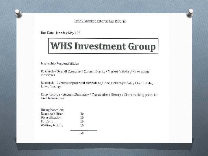 Stock Market O Short sell – Borrow Stock from Brokerage firm (unsold inventory or from another investor). Must return it in the future. - Borrow - hope market goes down – Short cover (buy back) at lower price - pocket difference. - sell 200 @ $50 / share = $10, 000 - buy 200 @ $40 / share = $8, 000