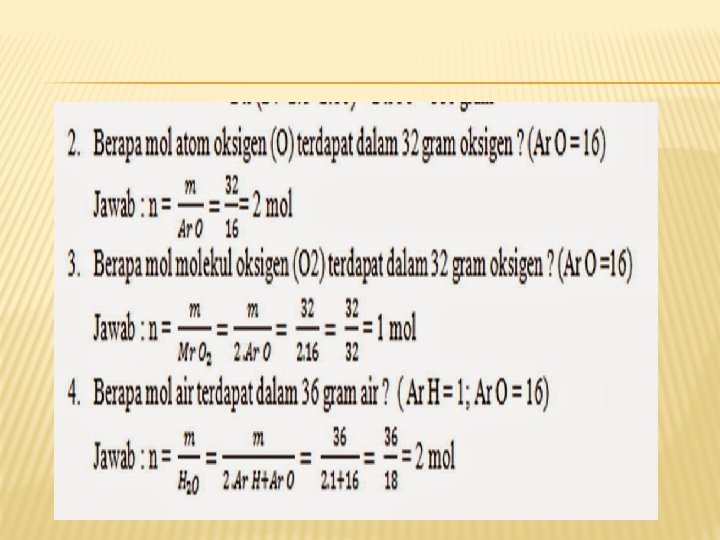 2. Tentukan Jumlah mol dari : a. 3, 01 x 1022 atom besi b. 1, 204 x 1023 molekul air Jawab : Rumus JP = n x 6, 02 x 1023