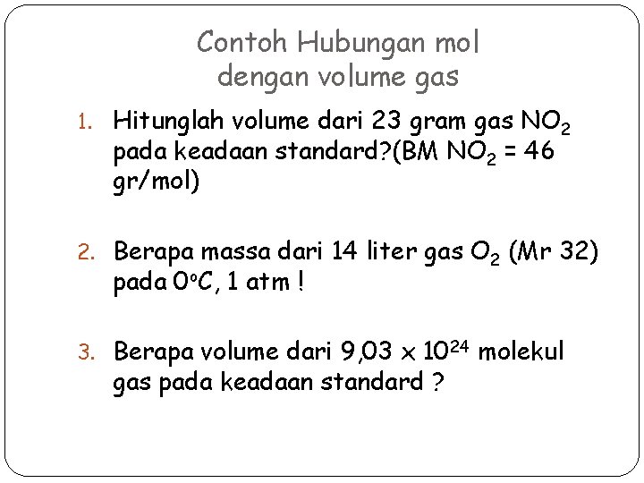 Contoh Hubungan mol dengan volume gas 1. Hitunglah volume dari 23 gram gas NO 2 pada keadaan standard? (BM NO 2 = 46 gr/mol) 2. Berapa massa dari 14 liter gas O 2 (Mr 32) pada 0 o. C, 1 atm ! 3. Berapa volume dari 9, 03 x 1024 molekul gas pada keadaan standard ?