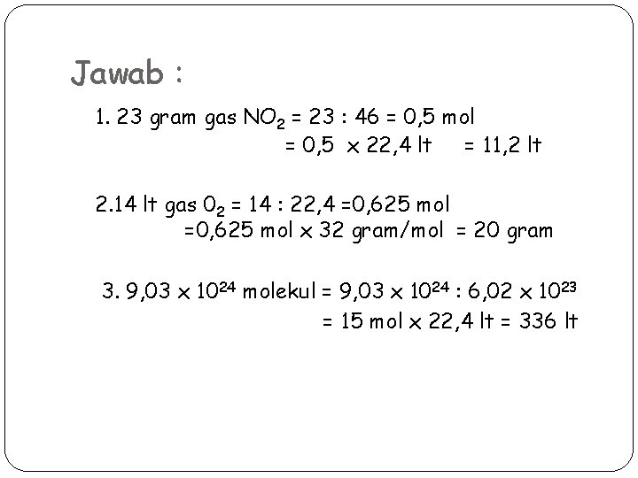 Jawab : 1. 23 gram gas NO 2 = 23 : 46 = 0, 5 mol = 0, 5 x 22, 4 lt = 11, 2 lt 2. 14 lt gas 02 = 14 : 22, 4 =0, 625 mol x 32 gram/mol = 20 gram 3. 9, 03 x 1024 molekul = 9, 03 x 1024 : 6, 02 x 1023 = 15 mol x 22, 4 lt = 336 lt