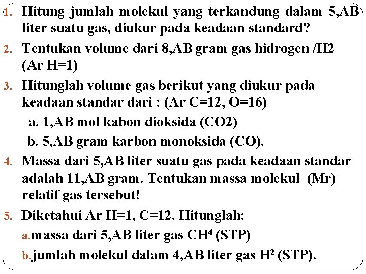 1. Hitung jumlah molekul yang terkandung dalam 5, AB 2. 3. 4. 5. liter suatu gas, diukur pada keadaan standard? Tentukan volume dari 8, AB gram gas hidrogen /H 2 (Ar H=1) Hitunglah volume gas berikut yang diukur pada keadaan standar dari : (Ar C=12, O=16) a. 1, AB mol kabon dioksida (CO 2) b. 5, AB gram karbon monoksida (CO). Massa dari 5, AB liter suatu gas pada keadaan standar adalah 11, AB gram. Tentukan massa molekul (Mr) relatif gas tersebut! Diketahui Ar H=1, C=12. Hitunglah: a. massa dari 5, AB liter gas CH 4 (STP) b. jumlah molekul dalam 4, AB liter gas H 2 (STP).