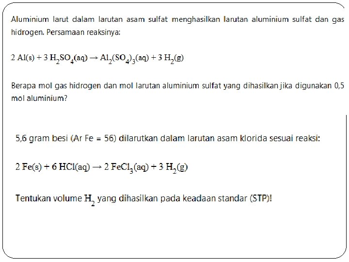 Contoh soal : Diketahui reaksi : N 2 + 3 H 2 2 NH 3 jika H 2 yang bereaksi adl 12 mol, berapa mol N 2 yang bereaksi dan berapa mol NH 3 yang terbentuk? Jwb : H 2 = 12 mol N 2 = 1/3 x 12 = 4 mol NH 3 = 2/3 x 12 = 8 mol Berapa gram gas O 2 yang diperlukan untuk membakar 260 gram asetilena (C 2 H 2) secara sempurna ? (Ar C = 12, Ar O = 16, Ar H= 1) 2 C 2 H 2 + 5 O 2 4 CO 2 + 2 H 2 O Jawab: C 2 H 2 = 260/26 mol = 10 mol O 2 = 5/2 x 10 mol = 25 x 32 gram = 800 gram