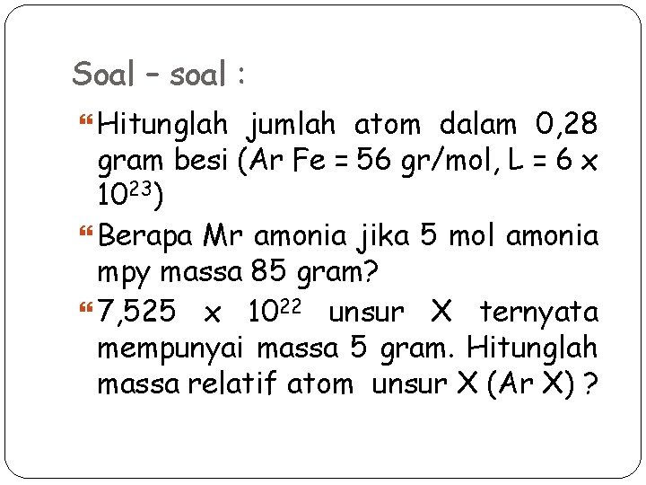Soal – soal : Hitunglah jumlah atom dalam 0, 28 gram besi (Ar Fe = 56 gr/mol, L = 6 x 1023) Berapa Mr amonia jika 5 mol amonia mpy massa 85 gram? 7, 525 x 1022 unsur X ternyata mempunyai massa 5 gram. Hitunglah massa relatif atom unsur X (Ar X) ?