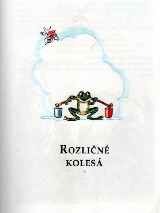Ježko znova niečo dobré vymyslel: - Vezmime každý po kolese! - Vezmime! Posnímali z voza kolesá a kotúľali ich domov: Muška maličké, ježko väčšie, žabka stredné. . . a kohútik vyskočil na najväčšie kolesisko, nohami preberá, krídlami trepoce a kričí: - Ki – ki – ri – kíí! Zajac sa smeje: - Hľaďte na čudákov, kotúľajú domov rozličné kolesá! Chvíľu sa vysmieval – a potom do kríka!