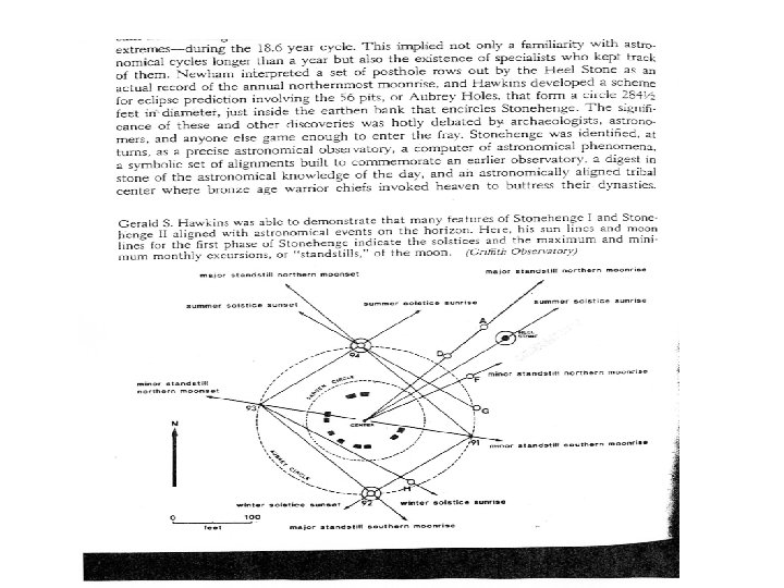 • WHENCE? The first choice of stones, called bluestones, came from South-West Wales, 200 km to the west. Between 60 and 80 bluestones arrived, each weighing 3 -4 tons, and there was one exceptional stone at 8 tons which was placed near the centre, on the summer solsticial axis, at the focus of the monument. • The later sarsen stones, weighing between 6 and 60 tons each, were dragged about 32 km (20 miles) southwards from near Avebury. Sarsens are the fractured remnants of ancient sandstone beds dating from the Eocene some 26 million years ago. The photograph, taken in the direction of midsummer sunrise, indicates the immensity of the sarsens of the outer ring. The overhead lintel, which weighs about 6 tons, is supported by 25 -ton megaliths. • WHEN DID THE STONES ARRIVE ? The bluestones came about 2550 BCE, possibly at a rate of just a few (3 to 6, say) annually. At some point, delivery of the bluestones stopped. This happened before the ring of bluestones had been completed. Fairly soon afterwards, sarsen stones started arriving, and their delivery is presumed to have taken one or two centuries commencing about 2500 BCE.
