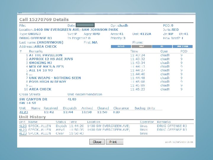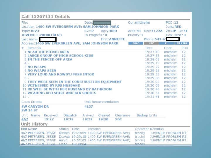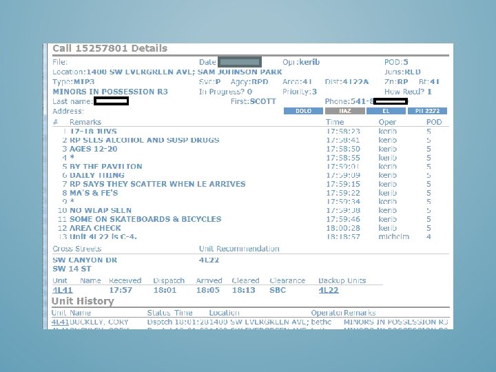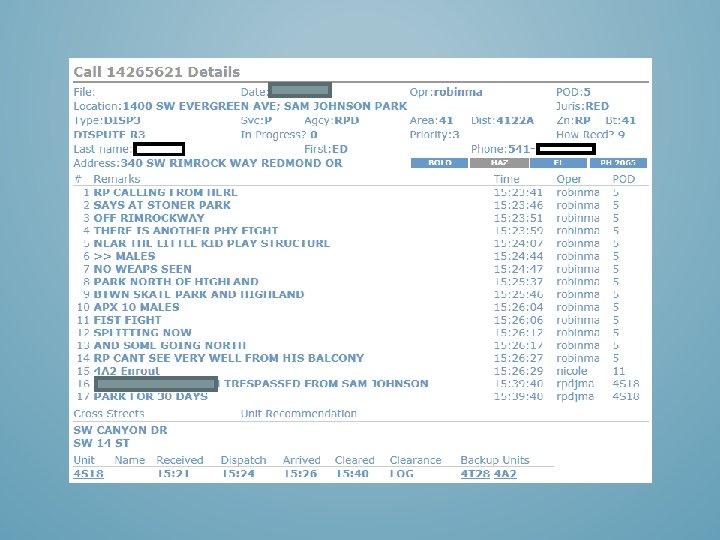 DURING THIS STUDY, DATA WAS GATHERED THROUGH DESCHUTES COUNTY 911 (DISPATCH), DESCHUTES COUNTY COMPUTER AIDED DISPATCH (MANAGED BY HI-TECH SYSTEMS) OFFICERS AND ADMINISTRATION OF THE REDMOND POLICE DEPARTMENT, DESCHUTES COUNTY SHERIFFS DEPARTMENT, THE CITY OF REDMOND PUBLIC WORKS, REDMOND AREA PARK AND RECREATION DISTRICT AND THE GENERAL PUBLIC.