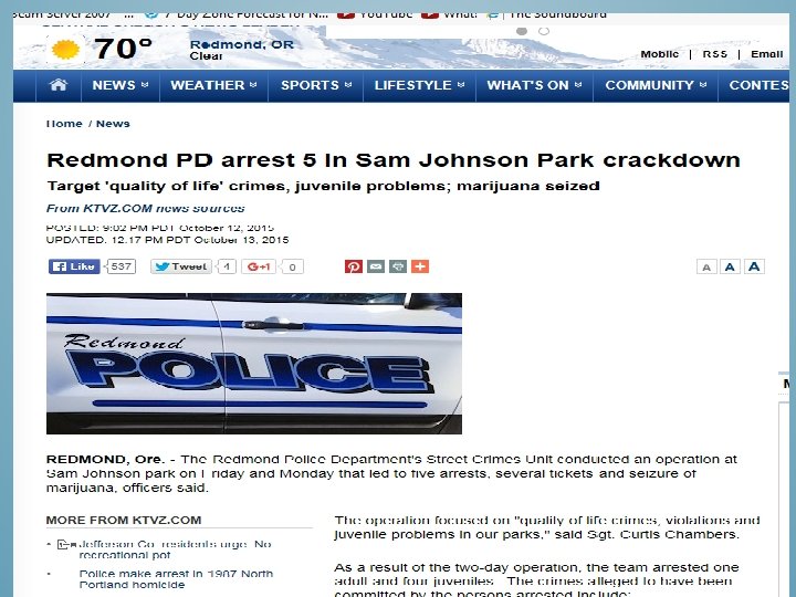 THE STRATEGIES WE WILL EMPLOY Signage, cameras, extra patrols, lighting (solar/green), encourage public to call. CPTED. Have the Redmond School District enforce it’s policy on kids in park during school hours. Establish a new City ordinance excluding kids from parks during school hours. Punch SW 15 th St all the way through, this will increase traffic, making the park better lit at night and more visible.