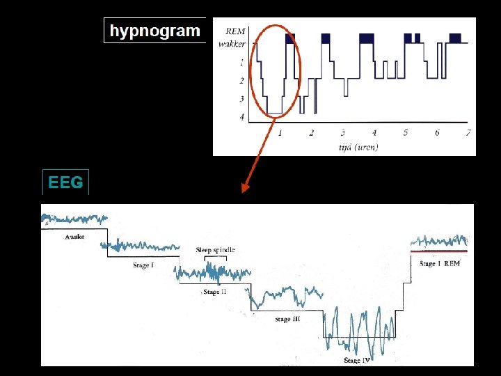 Slaap NREM-slaap (non-REM) (= rustige slaap: EEG rustig, ademhaling hartfreq , RR , spierspanning ) onderverdeeld in: - lichte slaap: stadium 1. doezelig stadium 2. sluimeren - diepe slaap: stadium 3. en stadium 4. afgewisseld met: REM-slaap (= onrustige slaap: totale spierontspanning, EEG onrustig, ademhaling , hartfreq en irreg, RR , oogbewegingen, erecties)