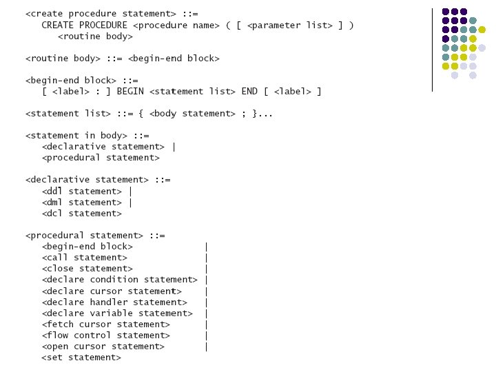 Body l Flow Control l <flow control statement> : : = <if statement> | <case statement> | <while statement> | <repeat statement> | <loop statement> | <leave statement> | <iterate statement>