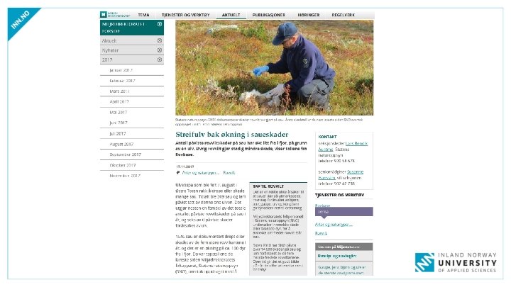 FORVALTNINGSRELEVANTE KONKLUSJONER Wabakken m. fl. 2017. Ulv som skadegjører på bufe, tamrein og hund i Norge. Oppdragsrapport Høgskolen i Innlandet nr. 2 -2017. Tap av sau på utmarksbeite • Enslige ulver på vandring, hovedsakelig født i Sverige • Kun 1 av 40 ulver avlivet i Norge ved skadefelling eller nødverge i beitesesongen (19972016) kom fra et av de 41 valpekullene født i helnorske revir • De siste 31 årene er 2/3 av alle ulvedrepte sauer i Norge registrert i Hedmark, og Rendalen står i en særstilling med store, kroniske ulveskader
