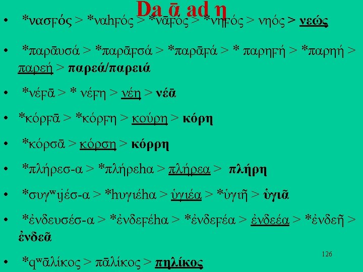 Caratteristiche eoliche • L’evoluzione labiale delle labiovelari in inizio di parola. • L’evoluzione scura della sonante |r| (ορ, ρο contro αρ, ρα); la chiusura del suono |o|. • Le desinenze in ‑εσσι, ἴα per μία, ἀπύ (lesb. tess. ), πεδά (lesb. beot. ), ἐξ > ἐς, le desinenze del pres. per il part. pf. att. , κε (lesb. tess. ) • Gli aggettivi patronimici (cf. il nuovo Posidippo, di Pella). 129