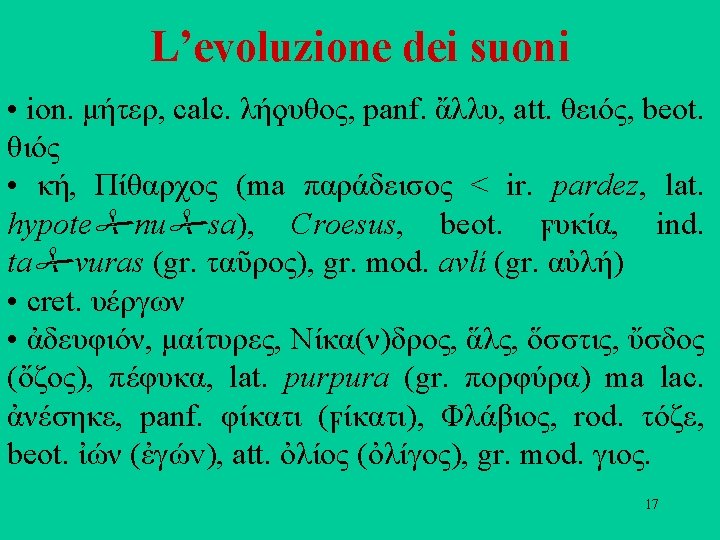 Il problema della pronuncia • La varietas nello spazio e nel tempo: tra scienza e scuola. • I dotti bizantini, Aldo Manuzio, Giovanni Lascaris (XVI sec. ). • La querelle tra Johannes Reuchlin (1455 1522) ed Erasmo da Rotterdam (Geerts, 1466 1536). • La pronuncia reuchliniana: η, ι, υ, ει, οι = |i|; αι = |e|; ου = |u|; αυ , ευ = |av|, |ev| (ante cons. sonora) |af|, |ef| (ante cons. sorda); β, γ, δ = |v|, |ğ|, |đ|; φ, χ, θ = |f|, |cħ|, |t’|; σ = |s| (sorda); ζ = |s| (sonora); μπ, ντ , γκ = |mb|, |nd|, |ng|. • La pronuncia erasmiana: Cratin. Dion. fr. 45 K. -A. ὁ δ’ ἠλίθιος ὥσπερ πρόβατον βῆ βῆ λέγων βαδίζει • Documenti e metodi per la ricostruzione: le testimonianze coeve (e il margine di errore), le trascrizioni in altre lingue (philosophia), oscillazioni (χρουσίω/χρυσίον) ed errori (ἐποίησν, ὑπαίρ, χαῖραι, ἔστευσα), grafie ipercaratterizzanti (Θαλhύβιος ), paralleli moderni (lac. ἀνέσηκε, krisá [κριθά], séri [θέρος]). • L’evoluzione delle vocali (progressiva chiusura), dei dittonghi 16 (monottongazione), del digamma (scomparsa).