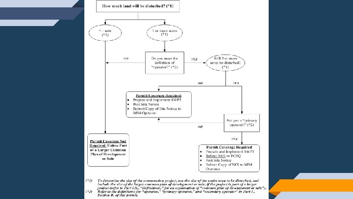 Disturb less than an Acre If the project site disturbs less than 1 acre and is not part of a larger common plan of development, coverage under the general permit is not required. Requirements: -implementation & maintenance of best manageable practices - notify MS 4 operator