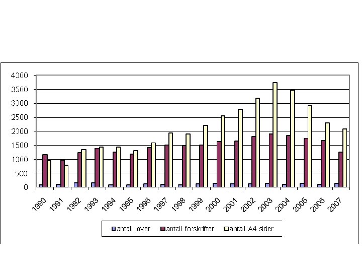 Sentrale problemstillinger har vært … • • Forenkling, opprydding, sanering, struktur Konsekvensvurderinger, effekt, kostnader/gevinster Språk, forståelighet, etterlevbarhet Nye reguleringsformer og tilsynsformer: systemfokus Risikobasert regulering og risikobasert tilsyn Vilkår for effektiv kontroll med regelverk (tilsyn) Vilkår for effektiv kontroll med regelverksproduksjon Mekanismer og institusjoner for styring, kvalitetssikring