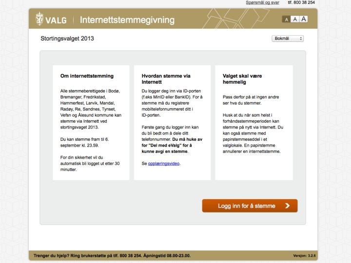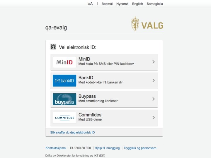 Premisser e-valgsløsning bygges på • Forskriftene baseres på valglovgivningen og Europarådets rekommandasjon for e-valg Rek 2004 - 11 • Full åpenhet og innsyn i prosjekt og løsning • Statlig eiet, driftet og forvaltet valgløsning. • Ansvar for valggjennomføring lokalt vil ligge i kommunene som i dag. • Kun benytte standard datamaskiner for stemmegivning • Autentisering baseres på den Id-porten/Min ID eiet av DIFI (Direktoratet forforvaltning og IKT)