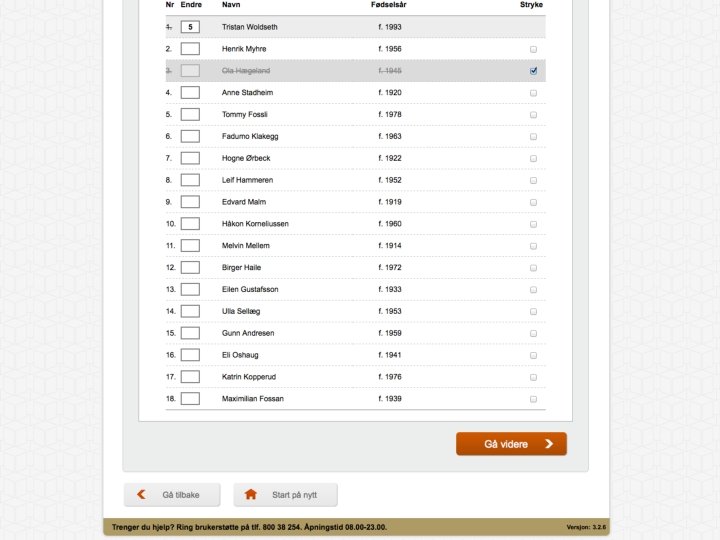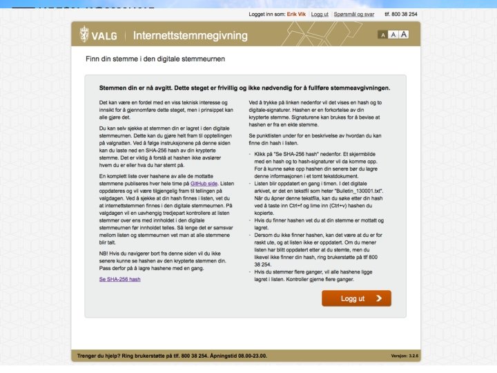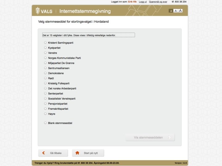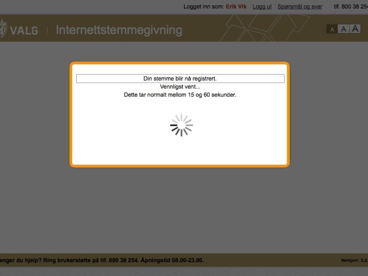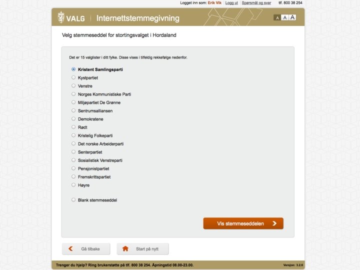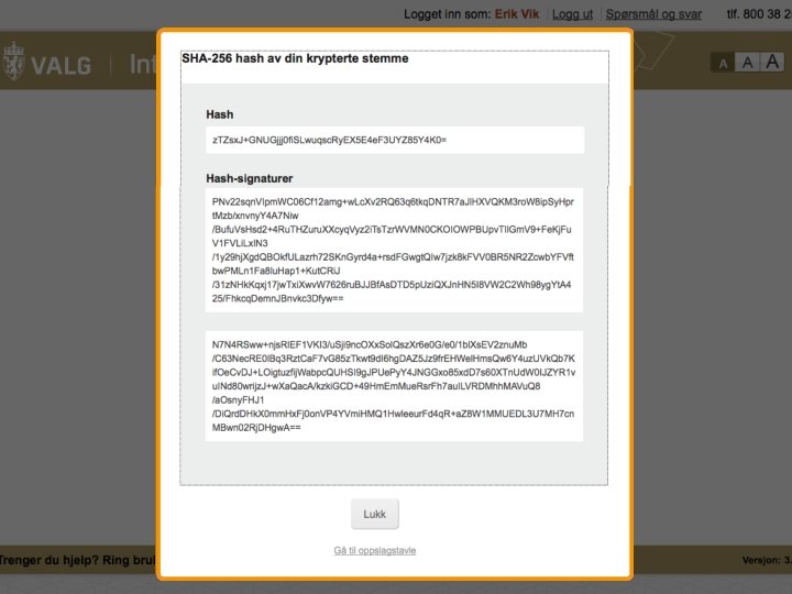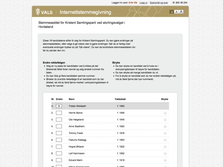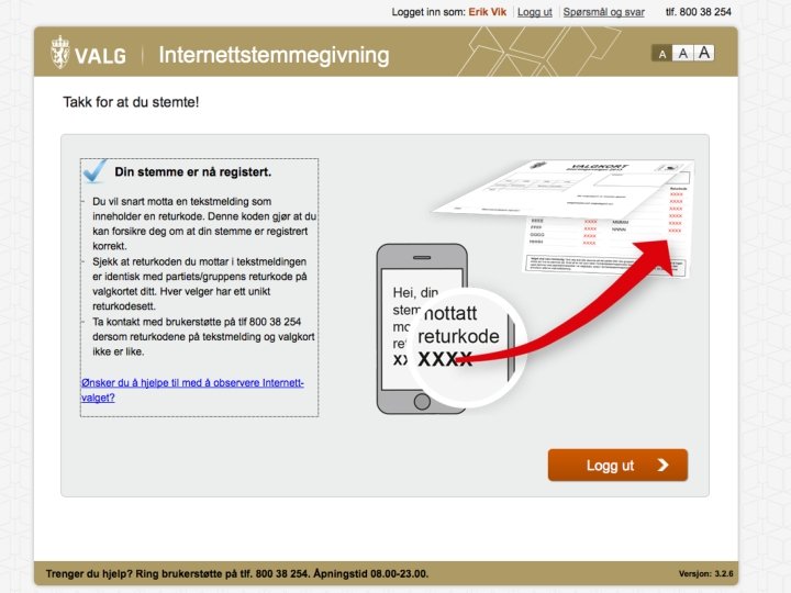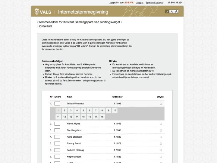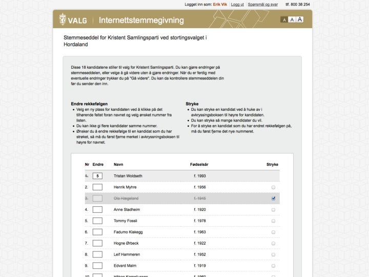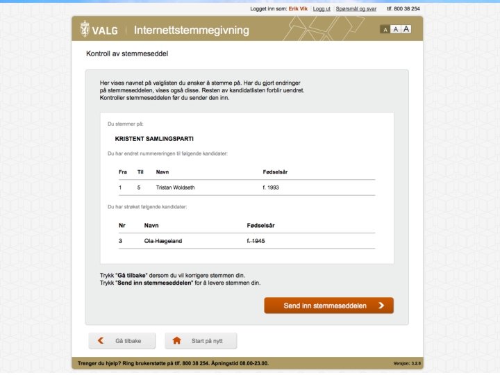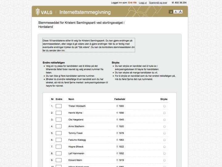 Hei, Erik Vik. Din stemme til stortingsvalget ble mottatt 7/9 -2013 kl 12: 18. Partiet / gruppen du stemte på har returkode 1758. Du strøk 1 kandidat og endret rekkefølgen til 1 kandidater. Kontroller returkoden mot valgkortet ditt. Ring 800 38 254 dersom kodene ikke er like.