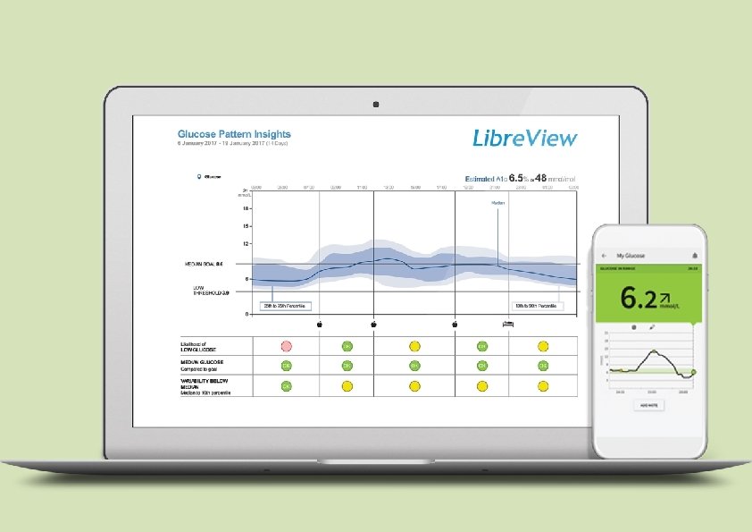 Freestyle Libre • FBG (flash blood glucose system) • Neukazuje data kontinuálně – nejsou alarmy • Informace po přiložení čtečky k senzoru – data za posl. 8 hodin • Nekalibruje se • Senzor měří 14 dní • Od 4 let věku ------------------------ • Aplikace Libre. View – data snímá mobilní telefon (NFC rozhraní) – po připojení (wifi, data) automaticky odesílá informace na cloud